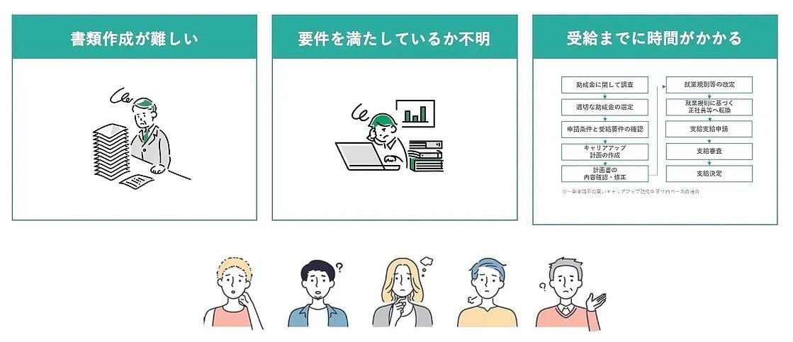 たとえば……「パンフレットと支給要領だけで100ページ以上も読み込む必要がある」「支給要件が複雑で労務に関する知識を持つ専門家でも要件の確認は大変」「必要な作業がいくつもあり、初めて申請される方はおよそ20時間以上かかる……」