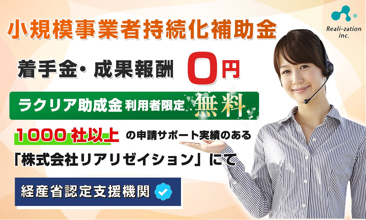「世界一優しい行政手続きに」をキャッチコピーとする、株式会社リアリゼイション(本社:東京都渋谷区)は、「小規模事業者持続化補助金」の申請代行について、同社サービス「ラクリア助成金」活用企業様むけに「着手金・成果報酬0円」のサービスを開始しました。