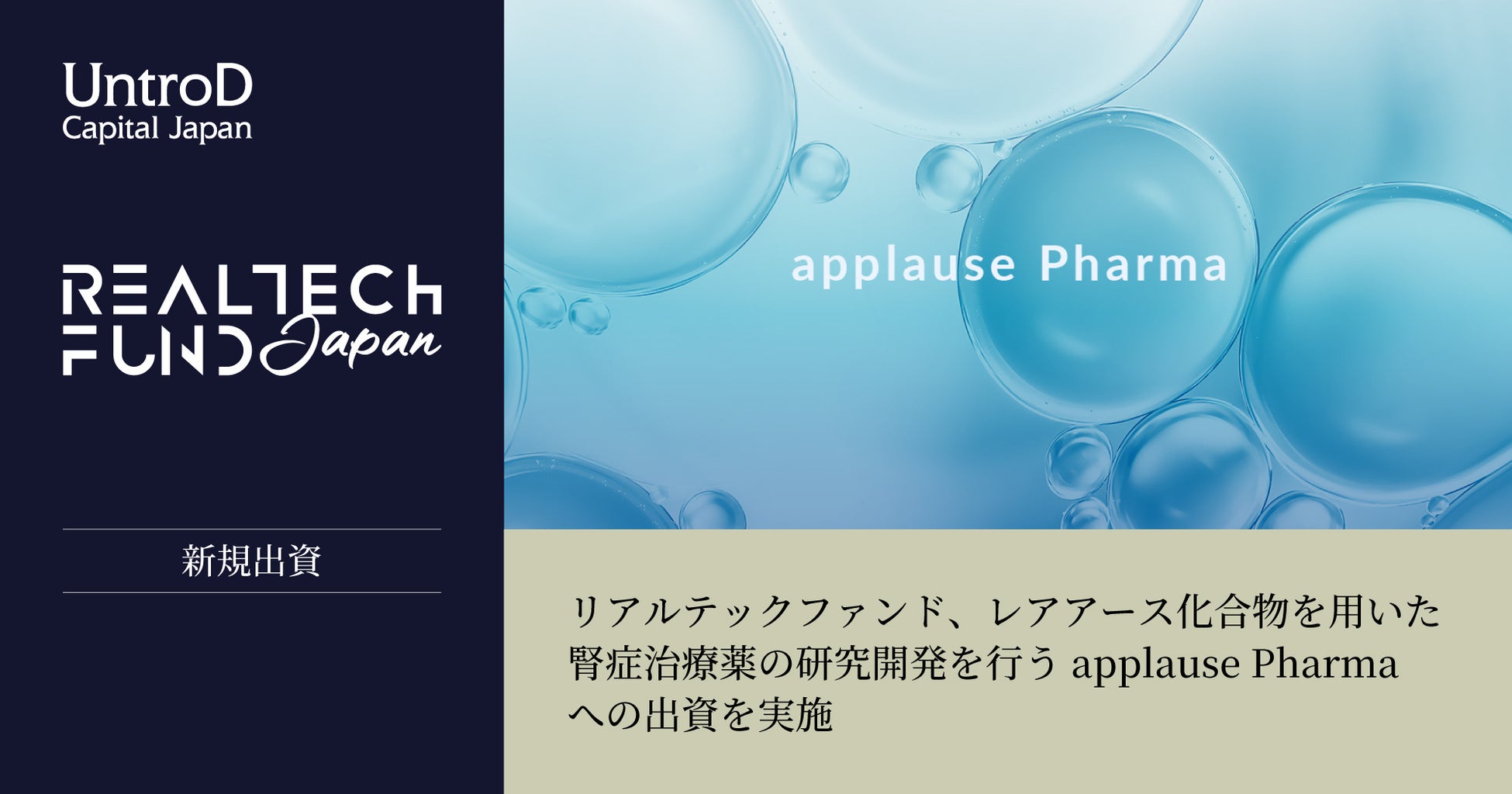 UntroD Capital Japan株式会社(所在地:東京都港区、代表:永田 暁彦)が運営するリアルテックファンド* は、腎疾患の治療薬開発を目指す株式会社applause Pharma(本社:東京都中央区、代表取締役:川口 恒隆、以下「applause Pharma」)へ投資を実施したことをお知らせ致します。applause Pharmaは今回の調達資金をもとに、レアアース由来の化合物により腎疾患をはじめとする複数の疾患の治療薬開発を目指します。