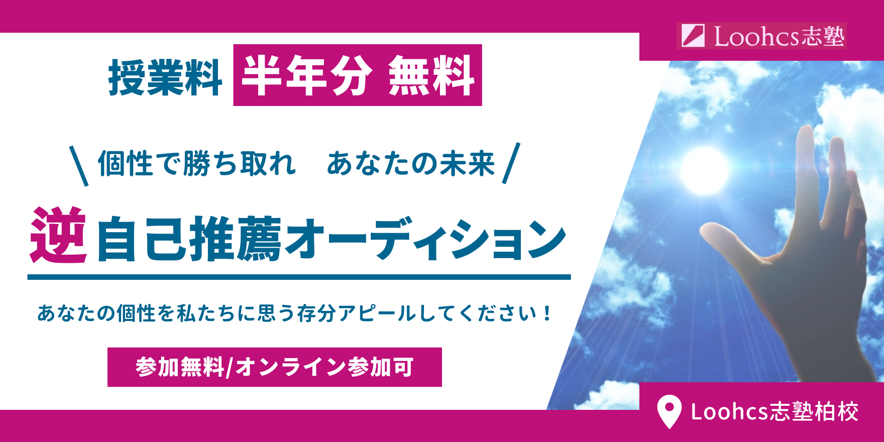 Loohcs株式会社(代表取締役 : 斎木陽平 本社所在地 : 渋谷区代々木)は、同社運営のAO入試専門の学習塾「ルークス志塾柏校」にて授業料半年分無料になる、「個性で勝ち取れ!”逆”自己推薦オーディション!」を実施致します。