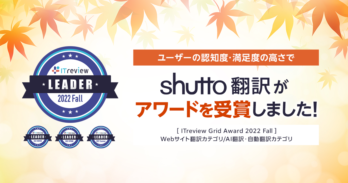 Webサイト翻訳サービス「shutto翻訳」、顧客満足度と認知度の双方が優れた製品として3年連続Leaderの称号を引き続き受賞!~「ITreview Grid Award 2022 Fall」
