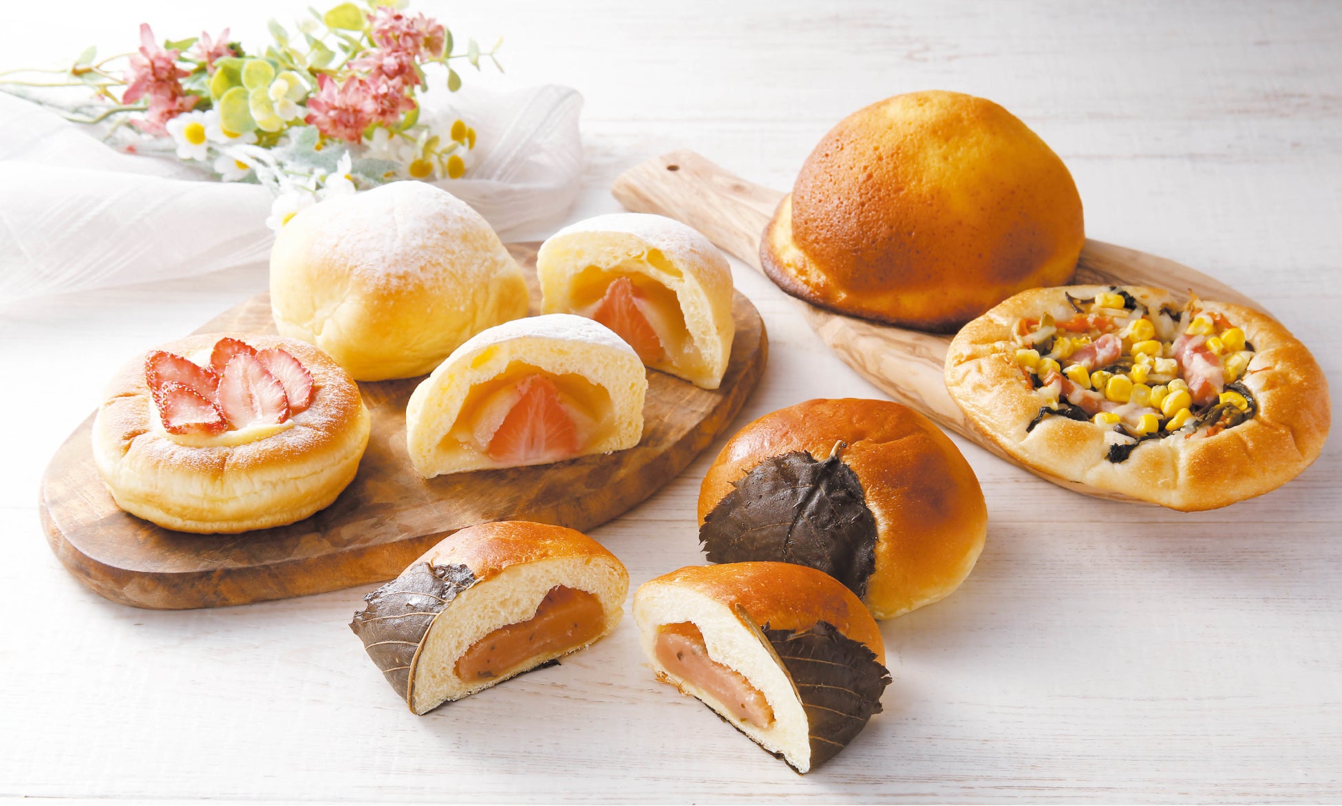 見た目が和菓子にそっくりないちごが丸ごと入った大福風パンやさくらあんぱんに旬の食材を使用した惣菜パンなど、春の訪れを感じる彩り豊かなユニークなパンが大集合!クイーンズベーカリー「春の行楽フェア」