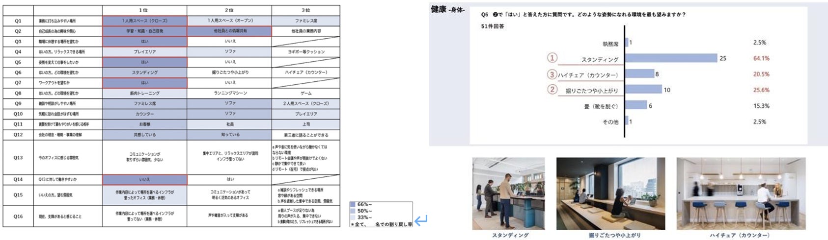 上記の声を参考に生産を上げるために新オフィスは「社外の方と円滑にオンラインMTGができる環境」、「自身がメリハリをつけて仕事ができる環境」、「社内メンバーとの円滑なコミュニケーションができる環境」の3つの環境を取り入れることで、仕事に対する生産性の向上を実現します。