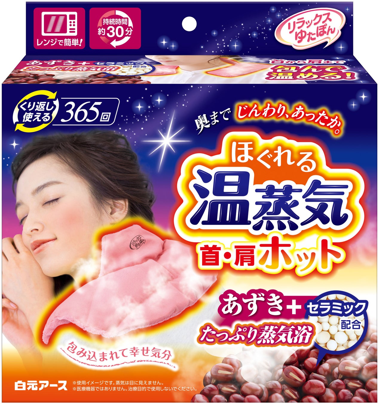 『リラックスゆたぽん ほぐれる温蒸気』シリーズは、あずきとセラミックの2種類からのたっぷり蒸気で気になる部位を温め、気分までほぐれる保温具です。2017年に毎日お使いいただけるように使用回数を365回に改良し、ご好評いただいております。