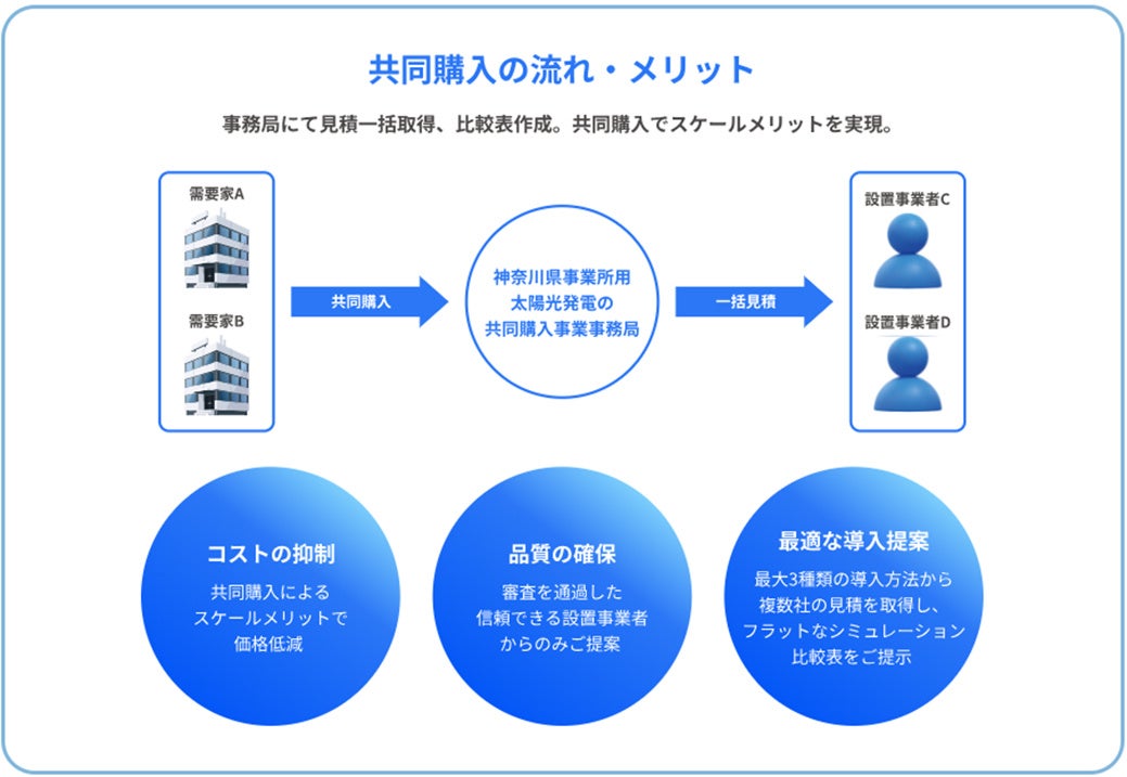 本事業は、共同調達によるスケールメリットを活かした価格低減を促すことで、さいたま市内の事業所に太陽光発電設備の導入を希望する事業者が、通常よりも安価に太陽光発電設備を導入できることを目指すものです。