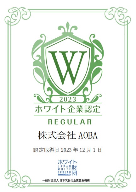 株式会社AOBAは2023年12月1日に「ホワイト企業認定 レギュラーランク」を取得されました!