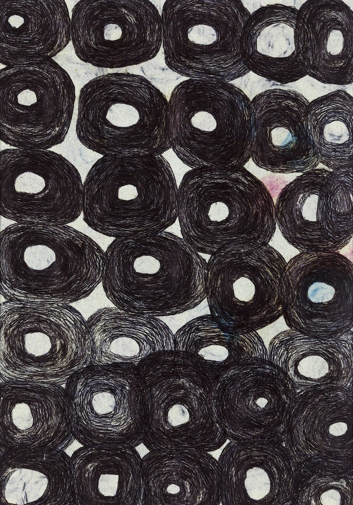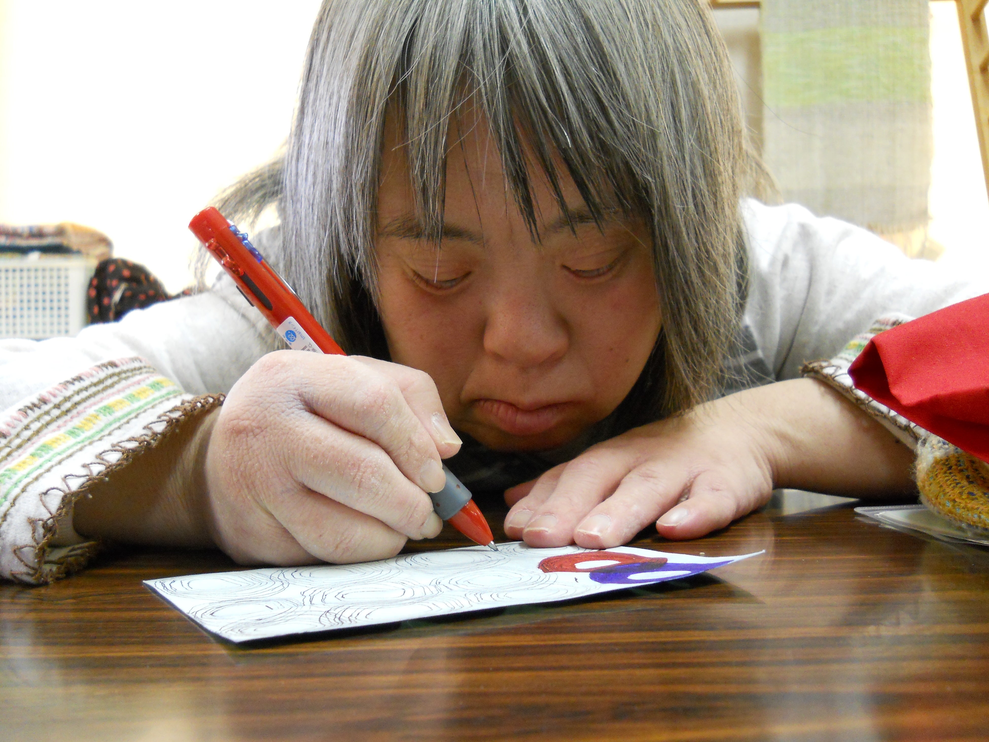 絵画のみならず織り物、切り紙、刺繍など、いずれも緻密で色彩と構成の妙に富む様々な表現を生み出し続けている。彼女は一つの仕事に数か月から数年集中して取り組んだあと、不意にやめて別の仕事に移るのが常。現在彼女が打ち込んでいるのは、丸く切り抜いた紙をいくつもの色で同心円状に彩色し、塗り終わった紙を壁に並べて貼っていくこと。