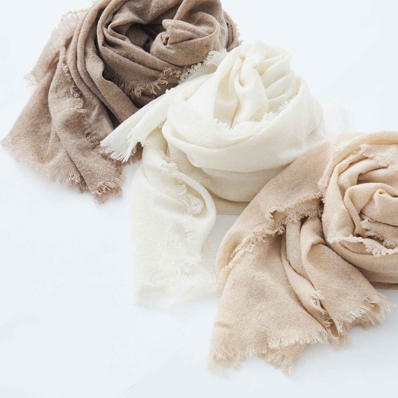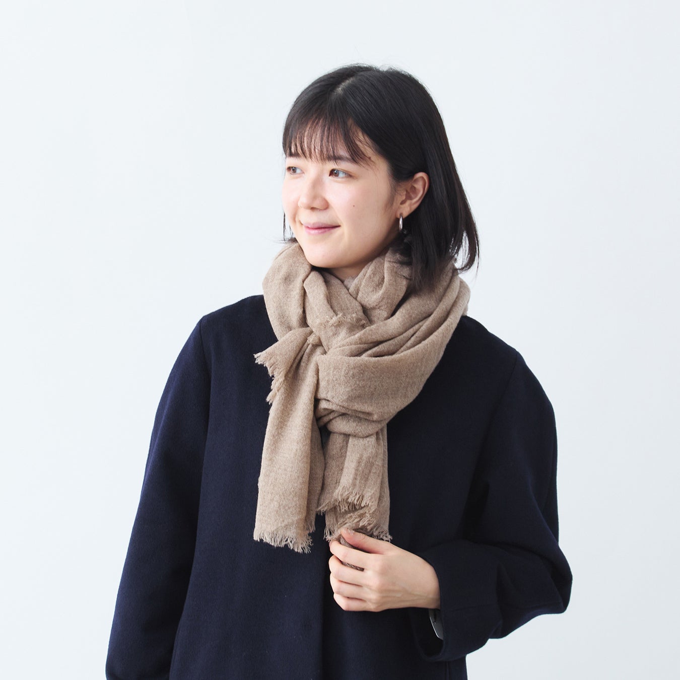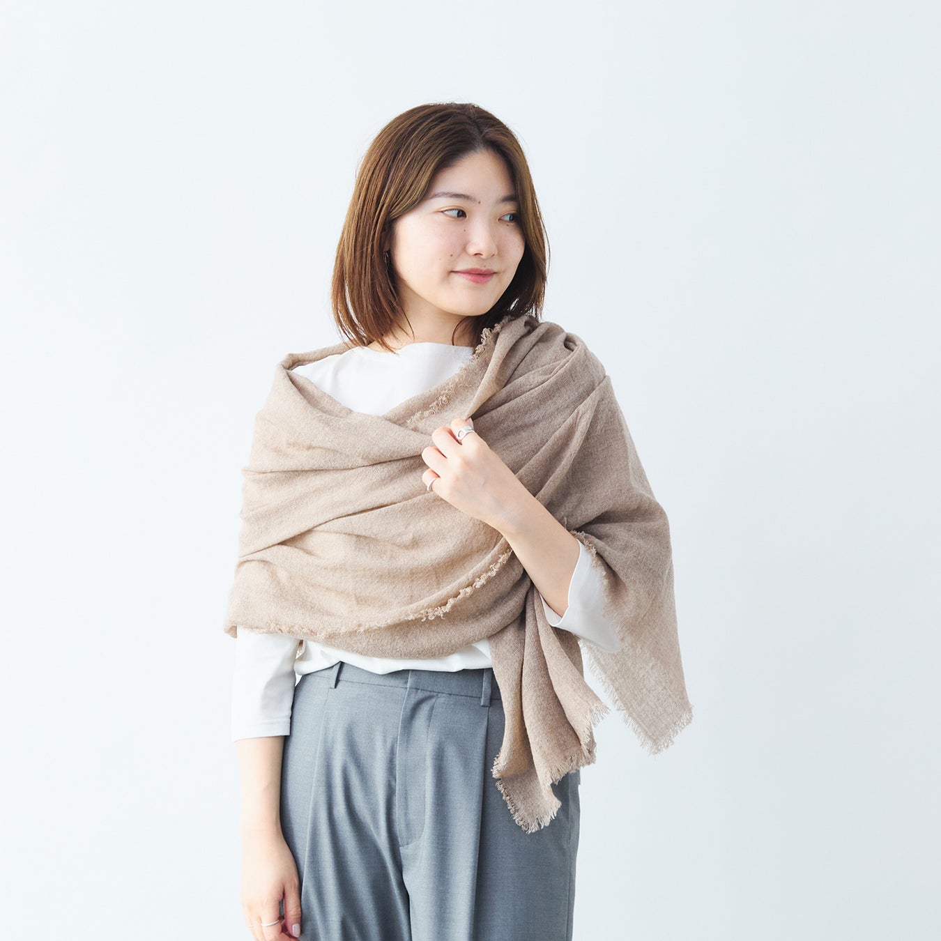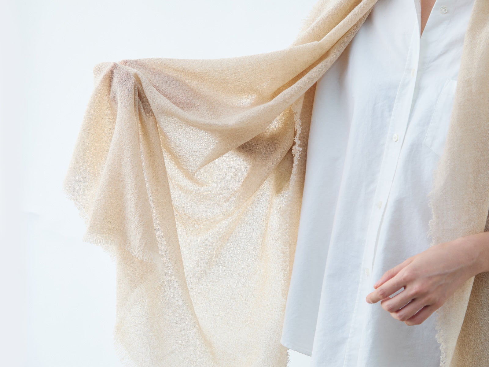 空気をはらんだ羽衣のようなカシミヤストールは、365日わたしたちの日常により添ってくれ、使い続けるほどに味わい深い風合いに変化していきます。