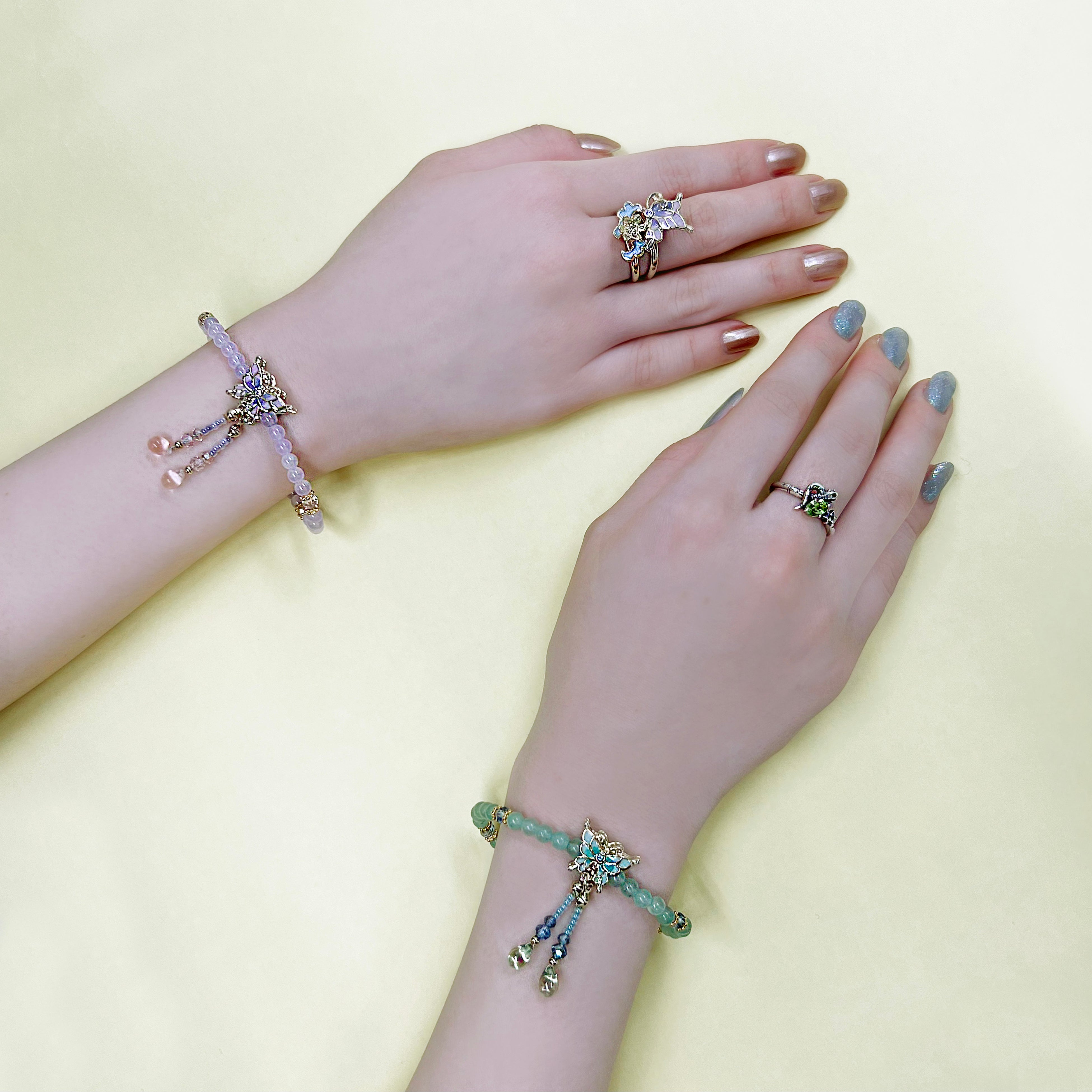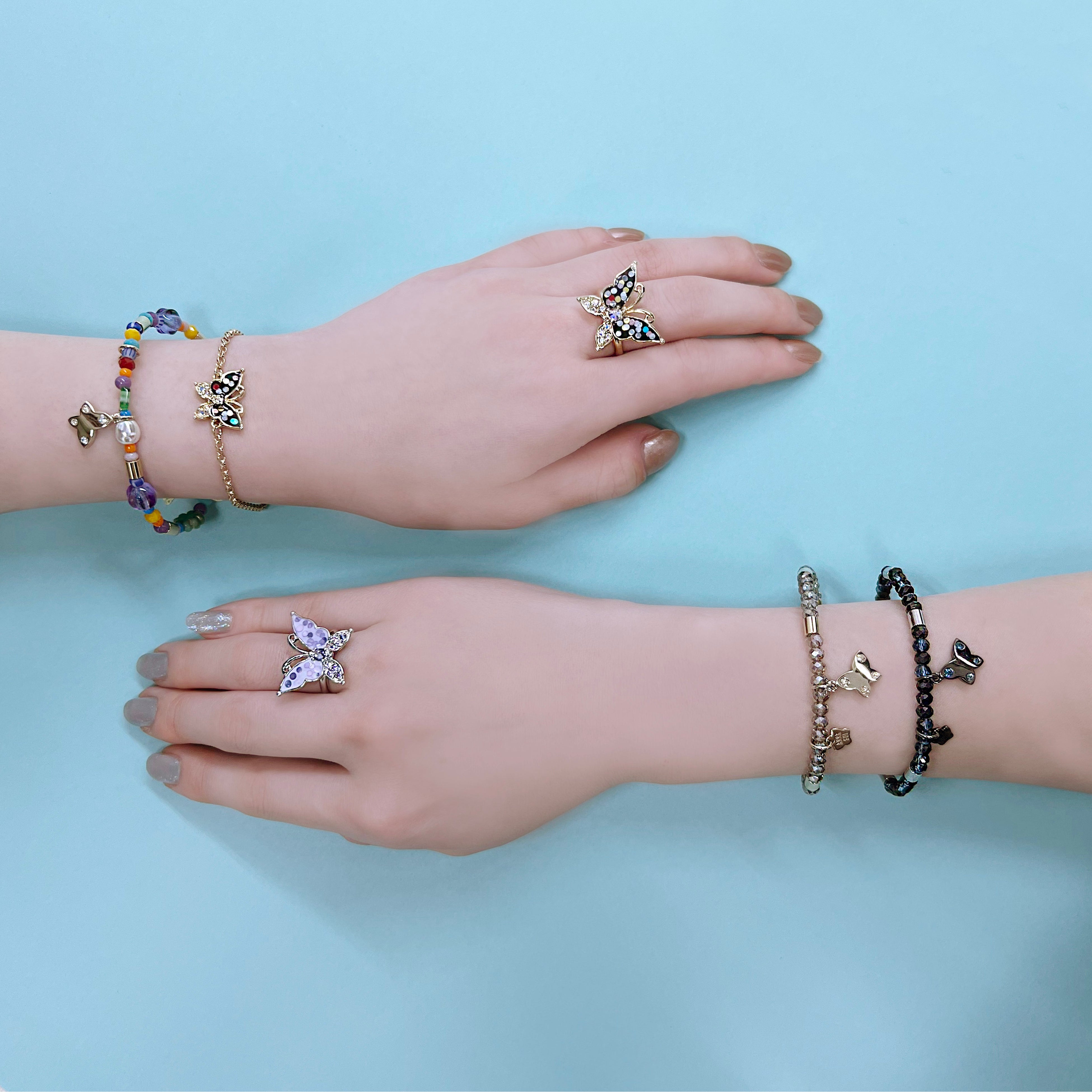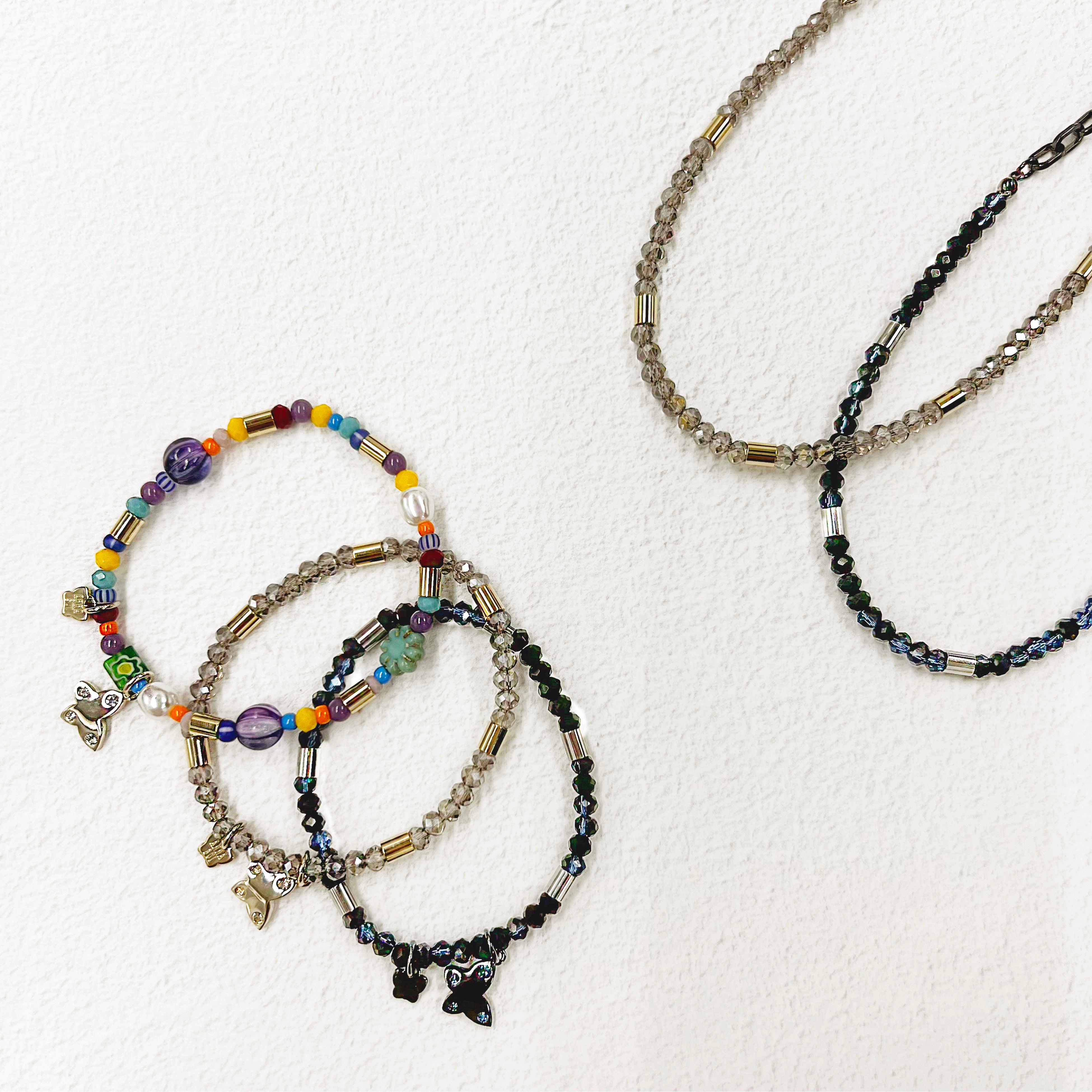 シックなカラーは重ね着けしやすく、POPなカラーは様々な色や形のビーズがプレイフル。