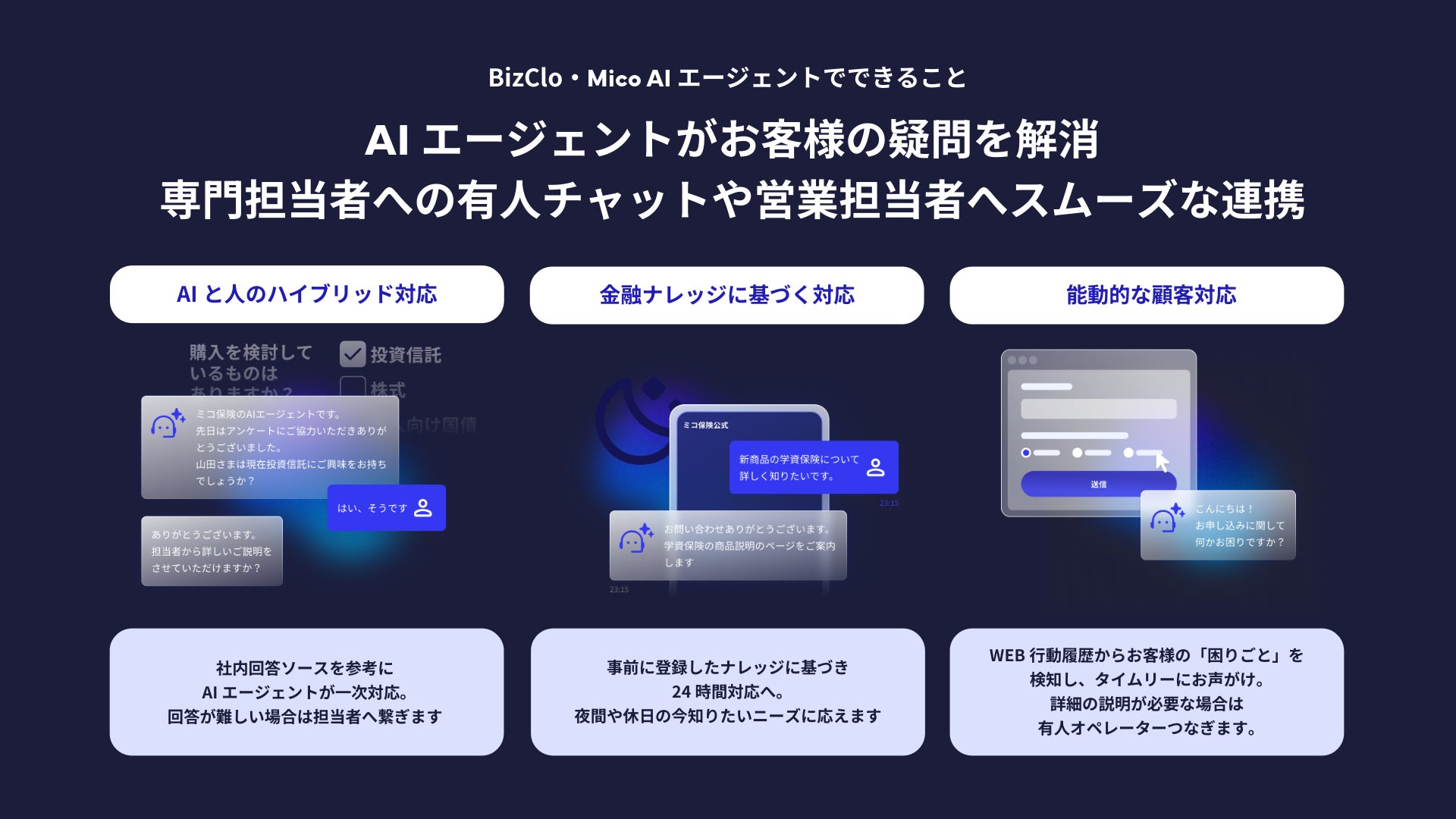 株式会社Mico(本社:大阪市北区、代表取締役社長:山田 修)は、提供するLINEビジネス1to1チャット『BizClo(ビズクロ)』において、金融機関の顧客対応プロセスに沿ったAIエージェント機能を新たに提供開始したことをお知らせいたします。