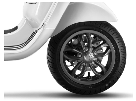 11 インチのフロントホイールに は 110/70、10 インチのリアホイールには 120/70 のいずれもチューブレスタイヤを装着しています。ベスパ LX 125 はどんな状況でも安全に走行できるよう、フロントには直径 200m のディスクブレーキに、新たに ABS を装 備しています。