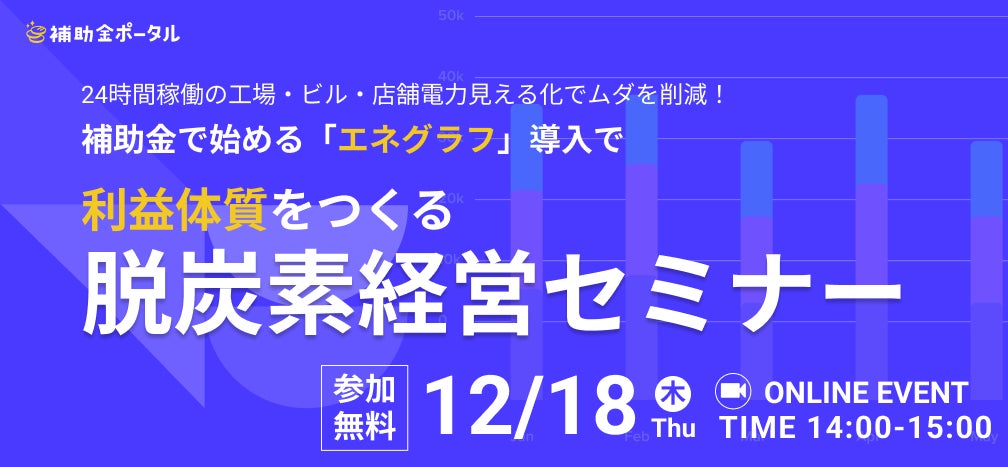 株式会社補助金ポータル(本社:東京都渋谷区、代表取締役:福井彰次)は、太平洋工業株式会社、株式会社ミドリノハシと共催で、「補助金で始める「エネグラフ」導入で利益体質をつくる脱炭素経営セミナー」をテーマにした無料オンラインセミナーを、2025年12月18日(木)14時より開催いたします。 Zoomでどなたでも無料でご参加いただけます。脱炭素経営やエネルギーコスト削減を検討している経営者・総務部門・生産部門の皆様、ぜひご参加ください。