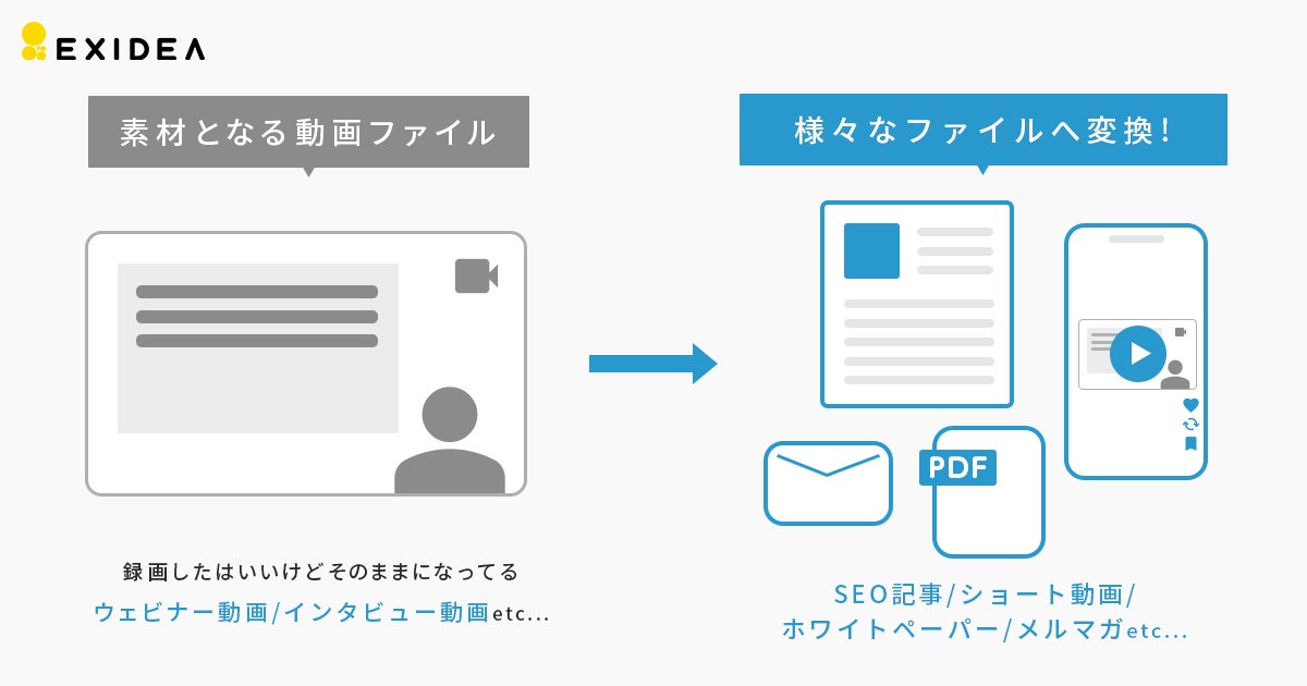 既存のコンテンツ(記事・動画・資料など)を別のフォーマットや配信チャネル向けに再編集して利用し、接点や訴求機会を生み出すことができます。