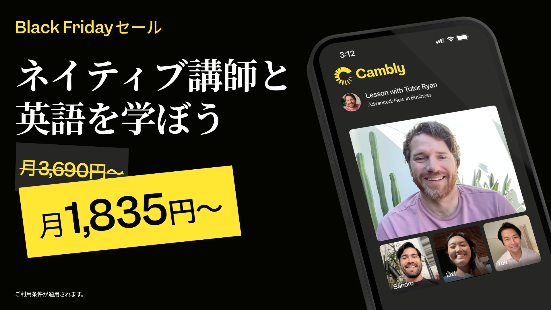 Cambly Inc.(本社:アメリカ・サンフランシスコ、日本代表:佐藤 亜希子)は、11月4日(月)から12月2日(月)まで、英会話レッスンが最大50%オフのBLACK FRIDAYセールを開催いたします。ネイティブ講師との英会話レッスンを通常月3,690円〜のところ、1,835円〜と今年最安値でご利用いただけます。