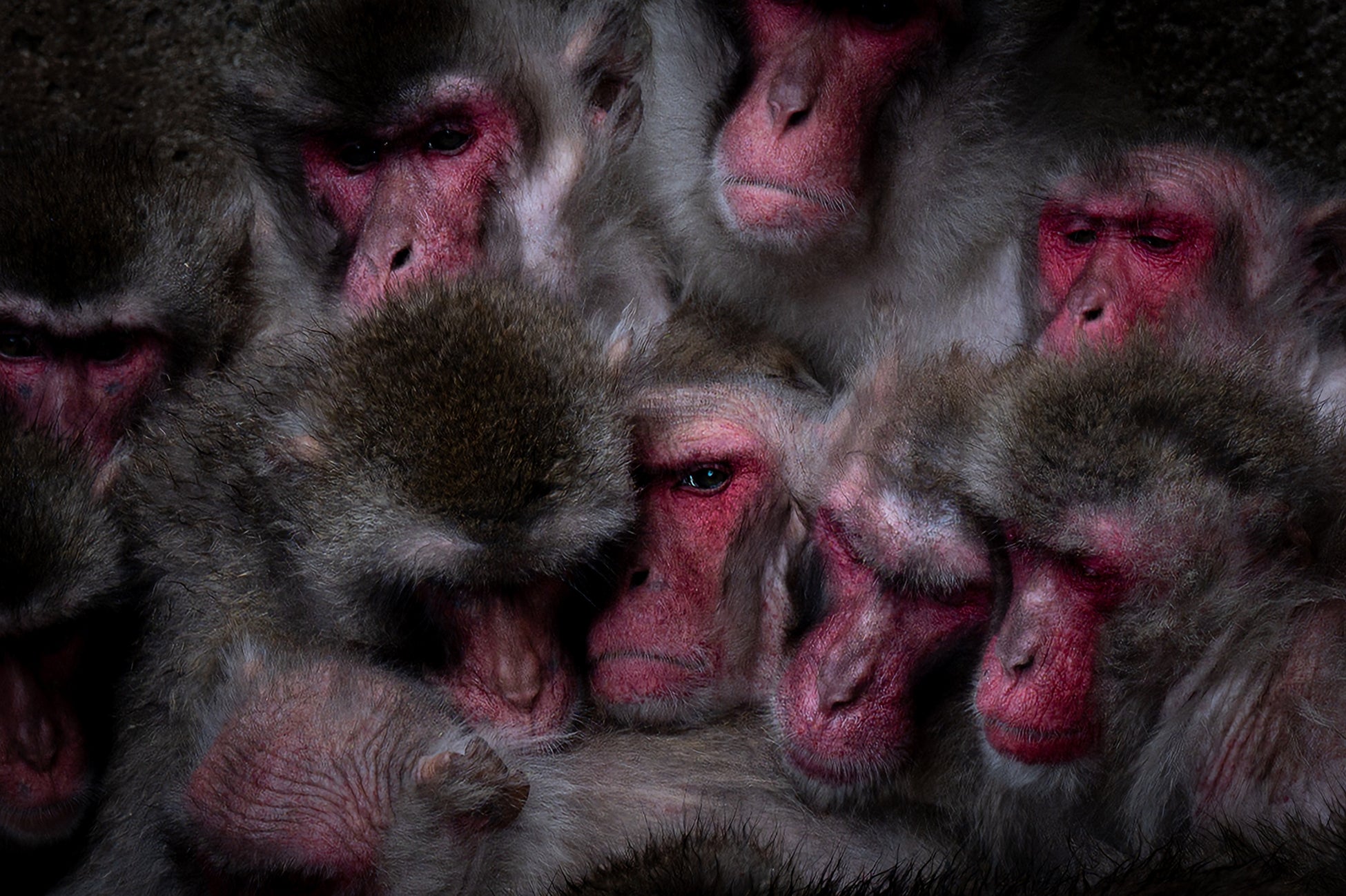 非常に印象深い作品に仕上がりました。サルの群れの作品は多く見ますが、本作は一味違いました。寒そうな表情のサルたちが体を限界まで寄せ合う中、一頭のサルだけがこちらをじっと見つめています。一頭だけ、というのが大きなポイントです。その強い目線は何かメッセージを語りかけているようにも感じられるのです。一方で人間のそれを思わせるなんとも切ない表情は、どこか満員電車の通勤風景も重なって見えたような気がしました。様々な思いやストーリーを想像させる、まさに写真ならではの表現が印象深い仕上げ感で深みを増しています。余計な情報を入れない構図バランスもよく非常にストレートでインパクトの強い作品となりました。