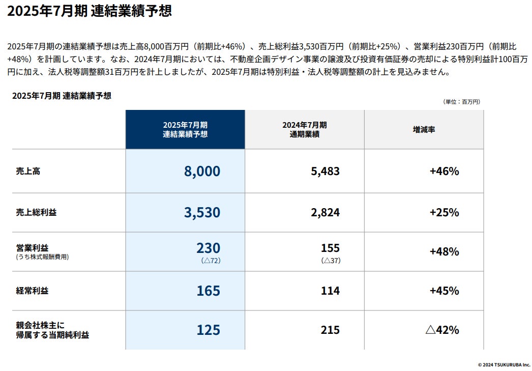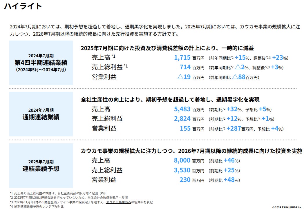ツクルバ 2024年7月期 通期決算を発表売上高は最高値を更新し通期黒字転換、2025年7月期は売上高46%増及び営利48%増を見込む