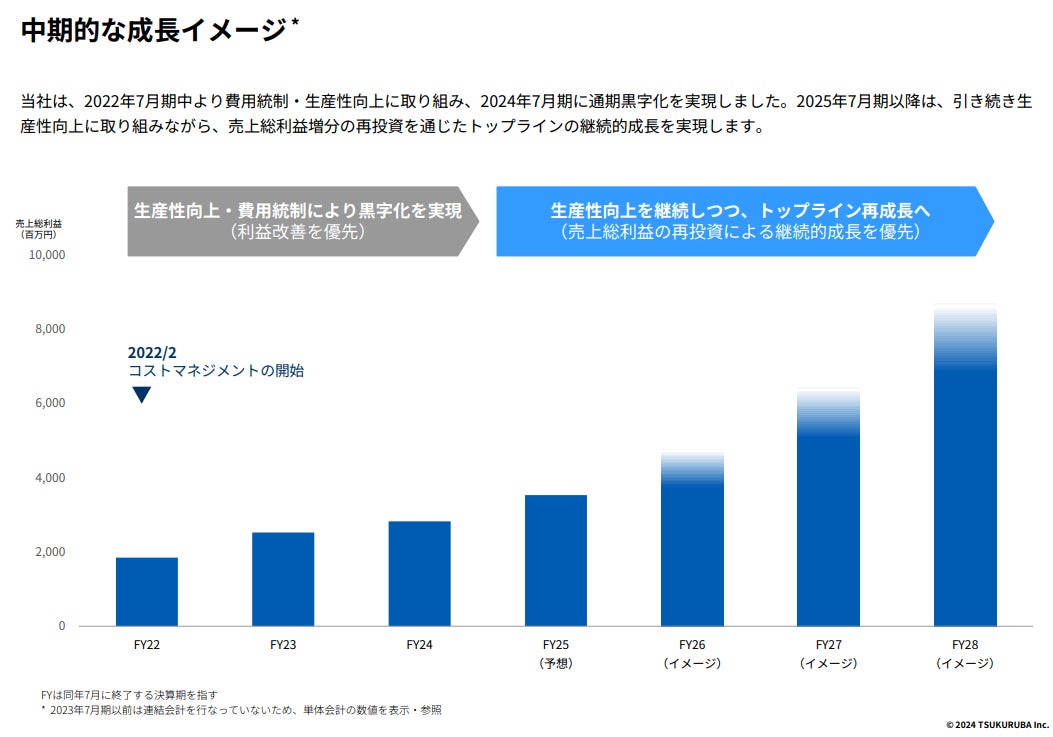 当社は、2022年7月期より生産性向上及び費用統制に取り組み、2024年7月期に通期黒字化を実現しました。2025年7月期以降は、引き続き生産性向上に注力しながら、創出利益の再投資を通じた売上総利益の継続的成長を推進します。