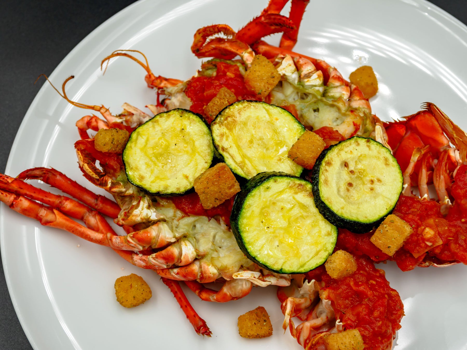 エルブドプロヴァンスという香草で香り付けをしたトマトベースのソースと、香ばしいクルトンを殻付きのロブスターに合わせました。