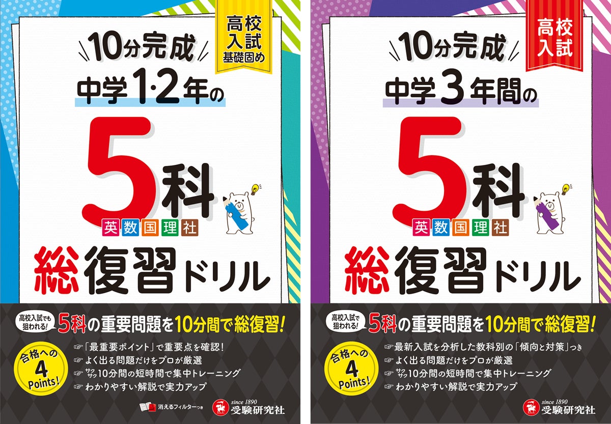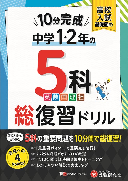 1冊で5教科すべての入試の基礎固め!部活で忙しくても<1日1ページ/10分>で取り組める。高校入試対策のスタートに最適な『10分完成総復習ドリル 5科』(中1・2/中学3年間)が新登場!