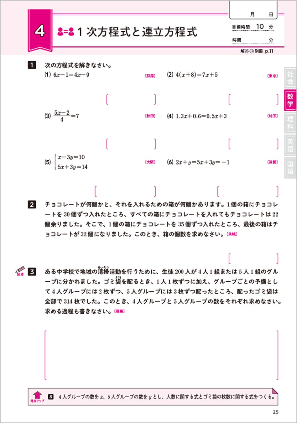 ・中学3年間の学習内容で入試によく出題される問題を教科ごとに10~16の単元(全66単元)に分けています。