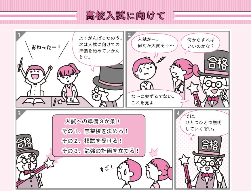 巻末に、オリジナルキャラクターが高校入試への準備や対策をわかりやすく解説するページを設けました。