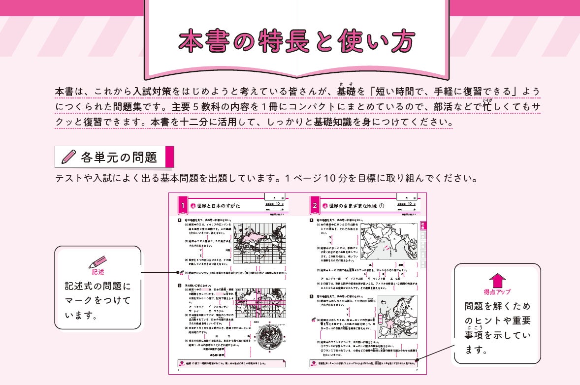 高校入試の基礎となる、中1・2年の5科(国・社・数・理・英)の総復習が短期間でできる問題集です。1単元は1ページだけ。10分で進められるので、部活などで忙しくても、苦手な教科でも気軽に取り組めます。