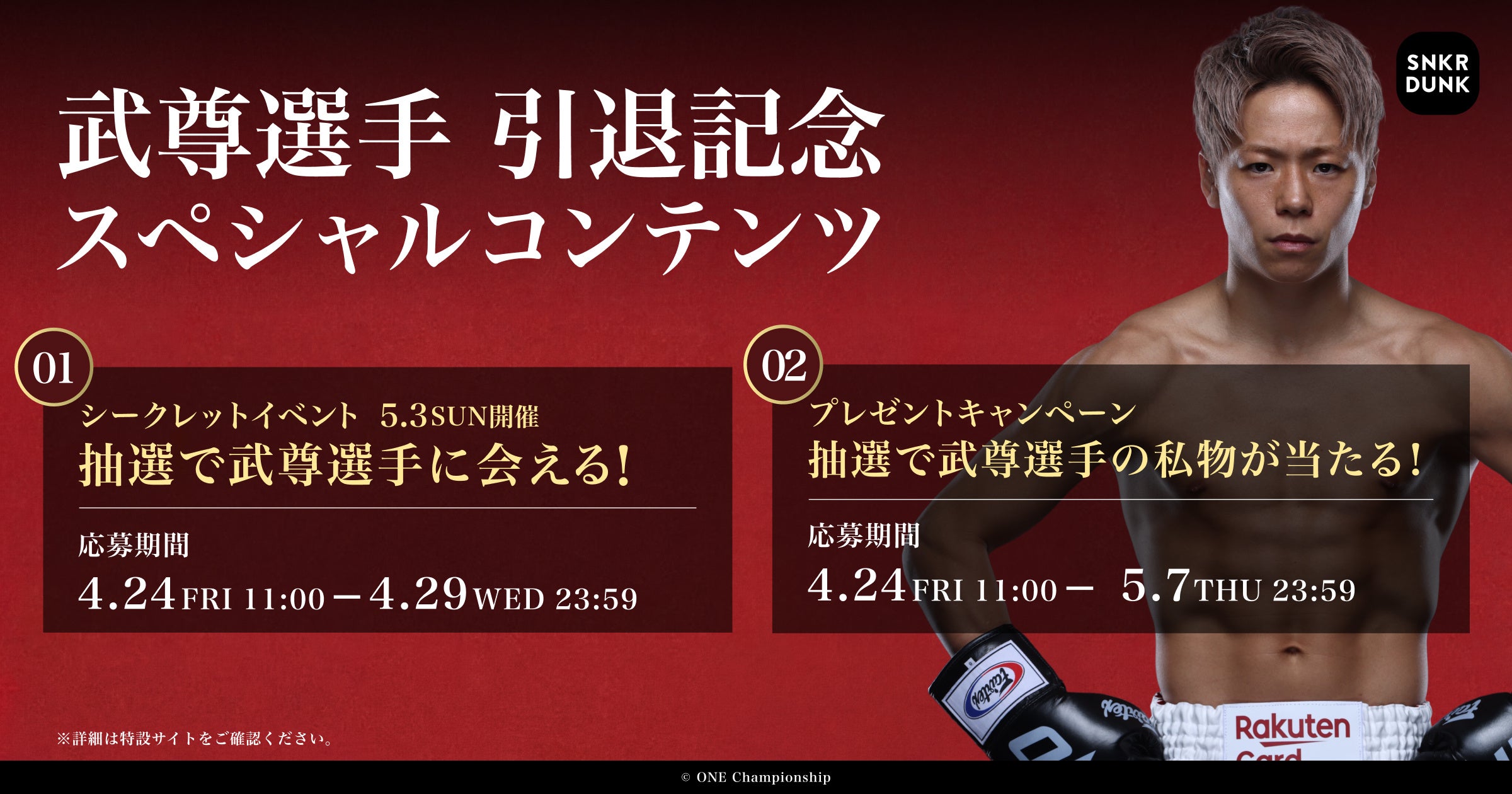 応募期間: 当選発表:2026年4月30日(木)17:00以降 ※抽選結果はメールにて当選者のみにご連絡いたします イベント開催日:2026年5月3日(日)16:00頃開始予定 会場:都内某所 ※当選者にのみ詳細をご案内いたします 内容:武尊選手との2ショット写真・握手会 ※事前抽選で当選されたご本人様と、同伴者1名様までご参加いただけます。 ※内容は予告なく変更となる場合があります。 |