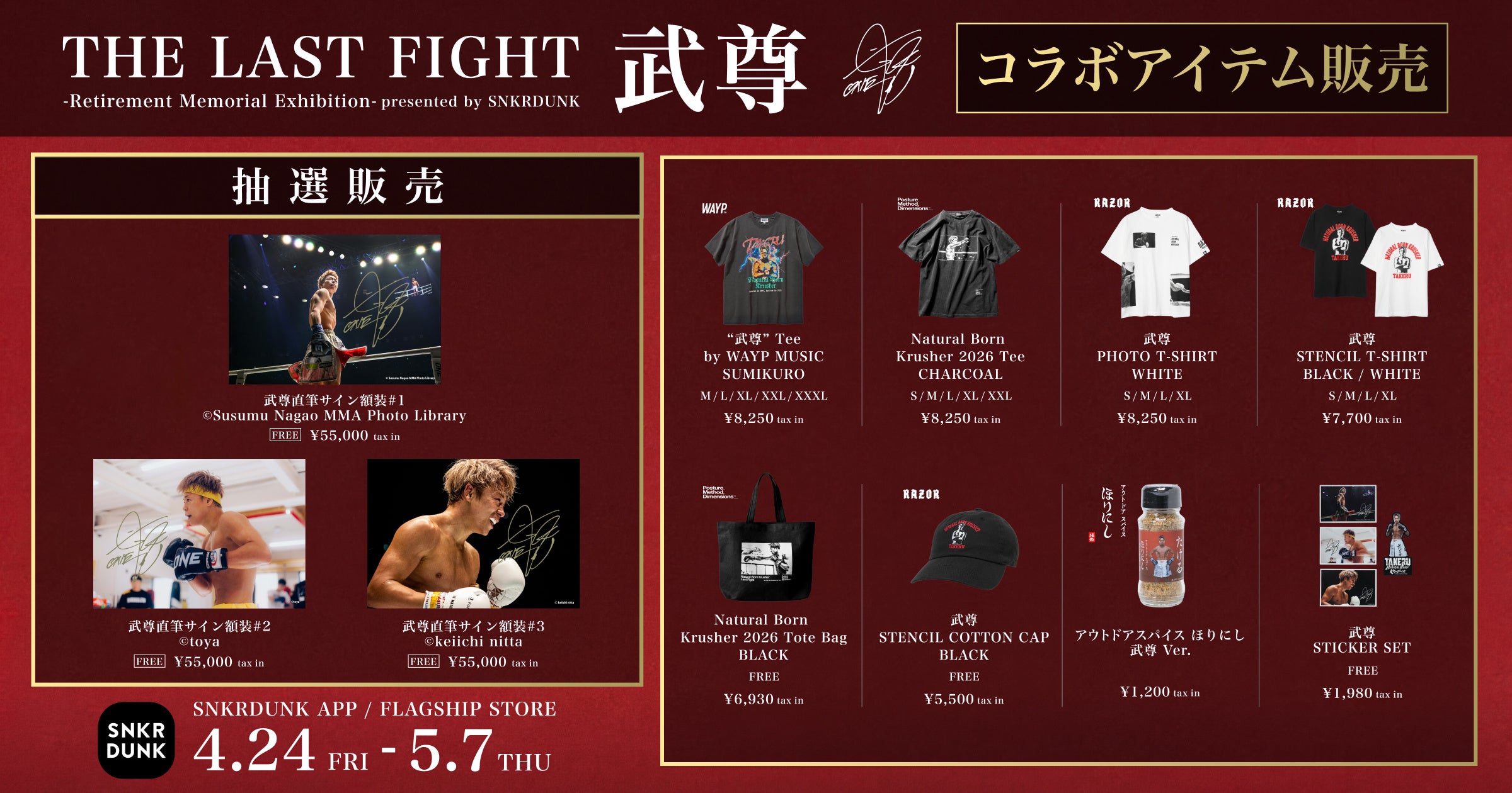 下記2点の条件をどちらも満たしている方が対象となります。 1. SNKRDUNKアプリにご登録いただいている方 2. 期間中、以下のいずれかで「THE LAST FIGHT "武尊" -Retirement Memorial Exhibition-」の商品を1会計につき合計¥10,000(税込)以上ご購入いただいた方 ・SNKRDUNKアプリ ・SNKRDUNK FLAGSHIP STORE(実店舗) ※お一人様につき1回のみご応募いただけます。 ※アプリ限定の「直筆サイン入り額装」への抽選応募金額も含まれます。 |