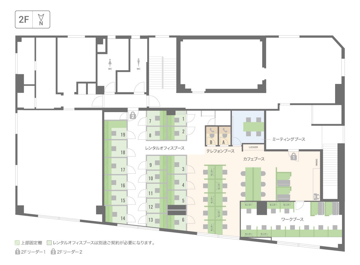 設備:Wi-Fi、フリードリンク、無料プリンター、ロッカー、ポスト、登記可、会議室、WEB会議用個室