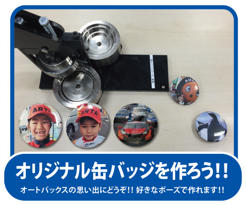 好きな写真で缶バッジが作れます!ガライヤに乗ってポーズを決めて、タイヤくんとのツーショットなど、オートバックスの思い出を缶バッジとして残そう!