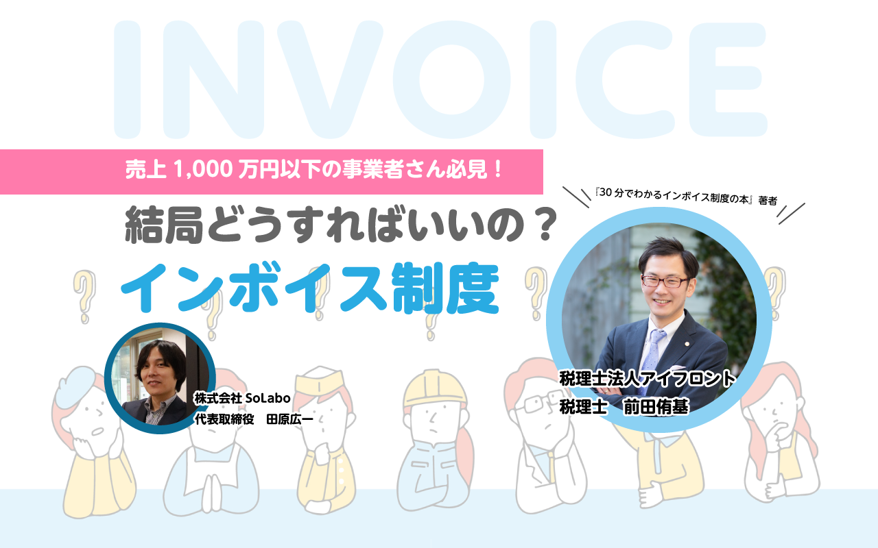 株式会社SoLabo(本社:東京都千代田区、代表取締役:田原広一、以下、SoLabo)は、税理士法人アイフロント(本社:愛知県名古屋市、代表社員:前田侑基、以下、アイフロント)と共同で、インボイスをテーマとした無料セミナーを開催いたします。