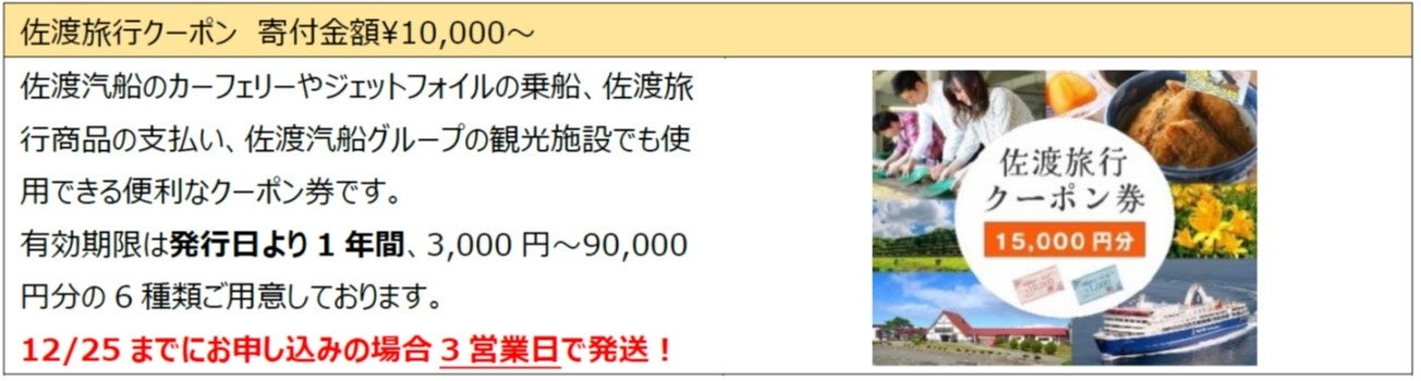 佐渡汽船で運営している新潟県佐渡市へのふるさと納税に特化したポータルサイト「【佐渡市ふるさと納税】サイトOperated by 佐渡汽船 ふる佐渡」では、佐渡汽船のカーフェリーやジェットフォイルのご乗船やグループのホテル・施設で使用可能な佐渡旅行クーポンをはじめ、佐渡産の海産物・お米・港で人気のお土産セットなどをふるさと納税の返礼品として取り扱っております。牡蠣や日本酒などの返礼品が11月から57品増えております。