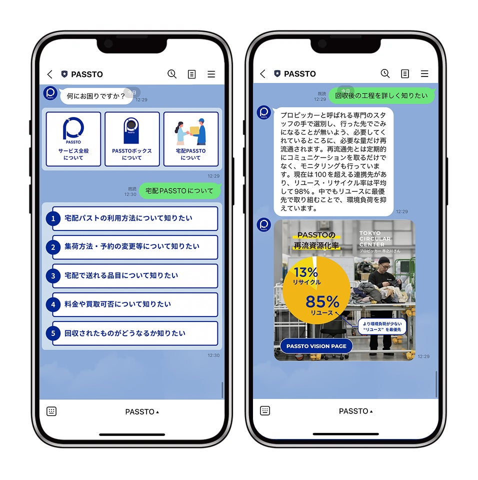 今年3月から、自宅から無料で不要品を手放せる「宅配PASSTO」のサービスを展開して参りましたが、このたび「PASSTO」のLINE公式アカウントおよびLINEミニアプリの提供を開始し、宅配PASSTOの申込みから集荷依頼までをLINE上で完結できるようになりました。生活者にとって「捨てない選択」がより簡単で身近なものになるよう、利便性の向上とともに、不要品をより楽しみながら手放せる仕掛けや、お得に手放せるキャンペーンなどの提供も進めていく予定です。これからも様々なパートナー様と連携しながら、暮らしにもっとも近い資源循環の入口としてPASSTOを広げていくことで、捨てない社会の実現を目指してまいります。