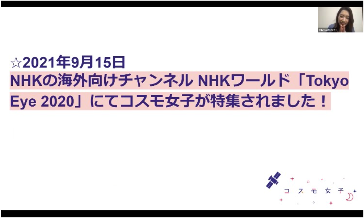 「コスモ女子」は、「宇宙を身近に」をテーマとした女性コミュニティです。現在、世界初の女性中心のチームによる人工衛星打ち上げプロジェクトに挑戦中。その活動は、NHKワールド「TOKYO EYE 2020」にて特集され、約160の国と地域で放送されました。