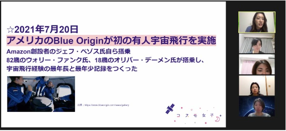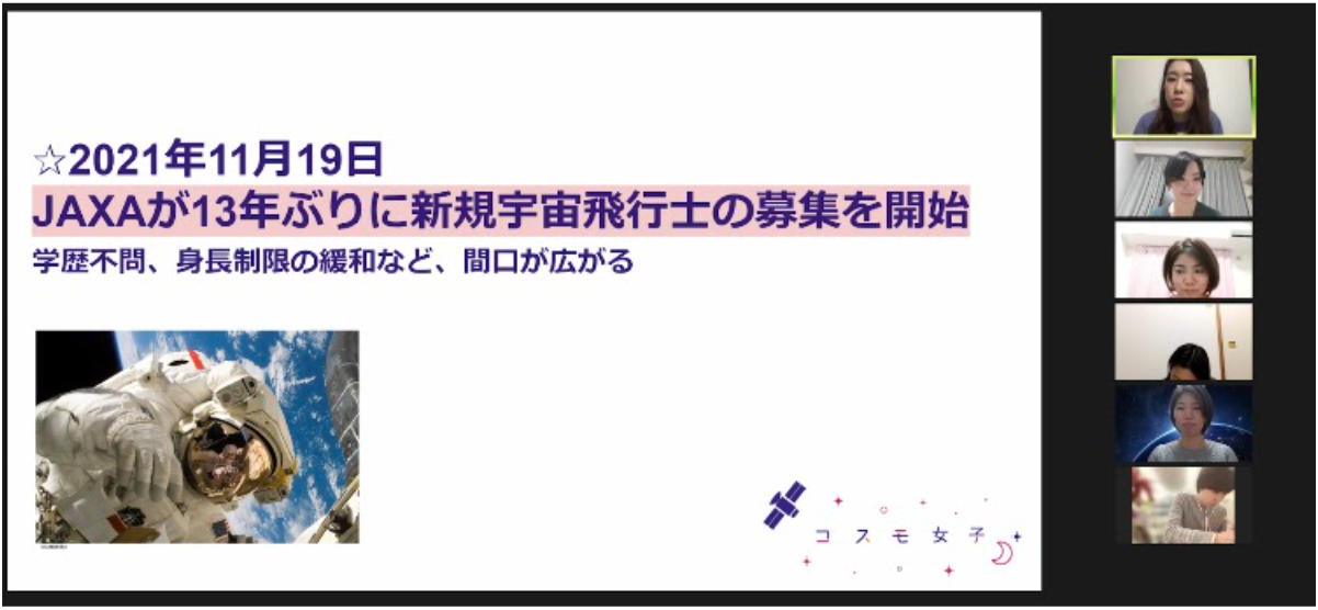 今回のイベントは、2021年の世界の宇宙関連ニュースと、わたしたち「コスモ女子」のニュースを振り返り、これからの宇宙分野について、一緒に語り合う時間となりました。