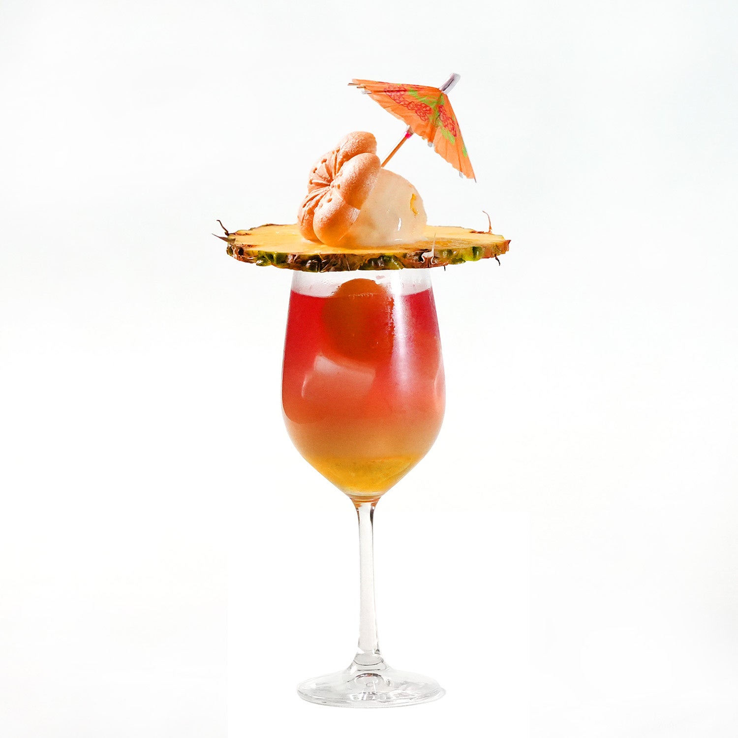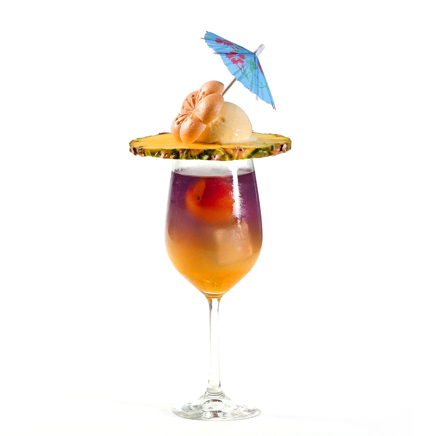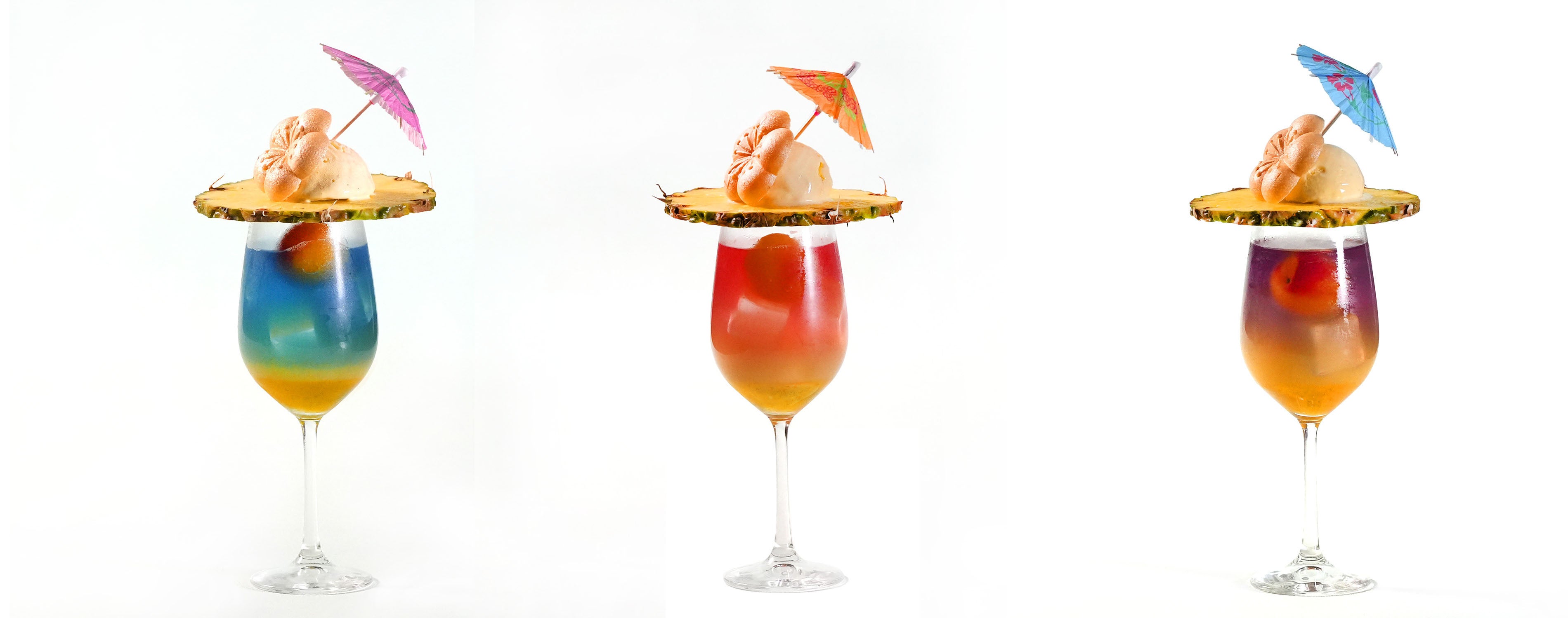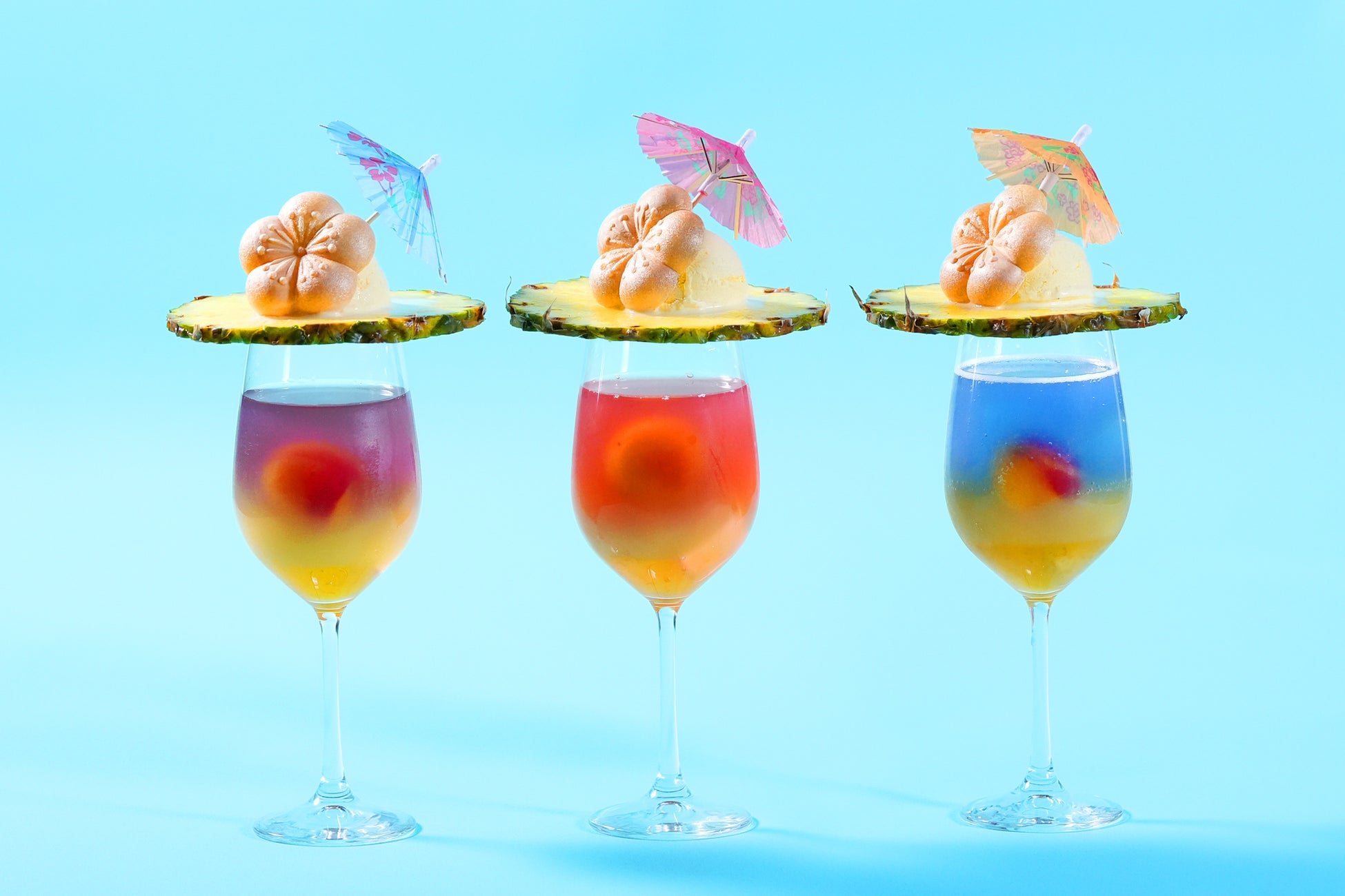 紀州産南高梅のオリジナル梅酒シロップをベースに、パイナップルやクランベリー、グレープフルーツやバタフライピーなどを組み合せ、時間の流れによって大きく変化する夏の海の風景を表現しました。各カクテルには、太陽や月をイメージしたフローズン完熟南高梅を1粒入れ、スライスしたパイナップルにバニラアイスと梅最中、気分を盛り上げる鮮やかなパラソルを添えました。