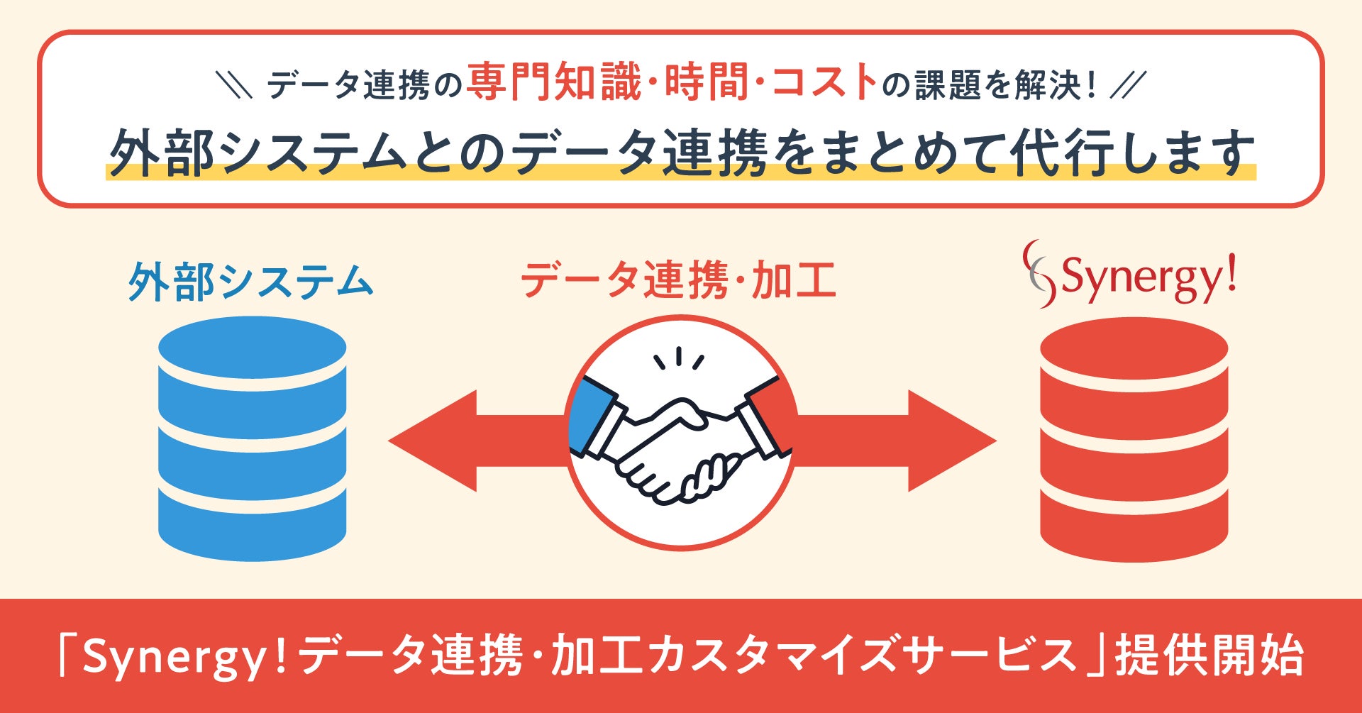 シナジーマーケティング株式会社(所在地:大阪市北区、代表:奥平 博史、以下当社)は、国産CRMシステム「Synergy!(シナジー)」を企業が利用中の顧客データ管理システムに連携し、より簡単に効果的なデジタルマーケティングを行っていただけるよう、データ連携・加工を代行する「Synergy!データ連携・加工カスタマイズサービス」の提供を開始しました。