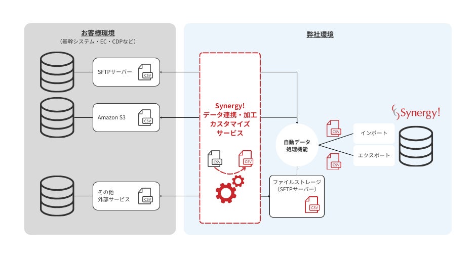 「Synergy!」は、Amazon S3や外部SFTPサーバへの相互連携が可能なデータ連携機能を備えており、企業の基幹システムやEC、CDPなど、多様なシステム間のデータ連携が可能です。今回の代行サービスの提供で、必要要件に柔軟に対応しながら、データ連携における専門知識、時間、コストの負担を軽減し、マーケティング担当者の業務の効率化を図ります。