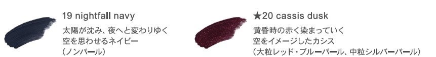 透明感とツヤ高いクリスタルクリアパウダーを配合し、美しい発色でツヤやかな仕上がりを叶えるニュアンスカラーマスカラから、上品で澄んだまなざしを叶える新色のネイビーラベンダーと、さりげない愛らしさを宿す限定のピンクブラックが登場。マスカラ下地、トップコートとしても使用できる強力なカール効果とカールキープ力で、まつ毛一本一本をしっかりと上向きに仕上げます。汗・水・涙に強いウォータープルーフタイプでありながら、クレンジングで簡単にオフが可能。まつ毛への負担感を軽減します。スライド性の高い球状パウダーにより、なめらかに塗ることができるので、重ねてもダマになることがありません。