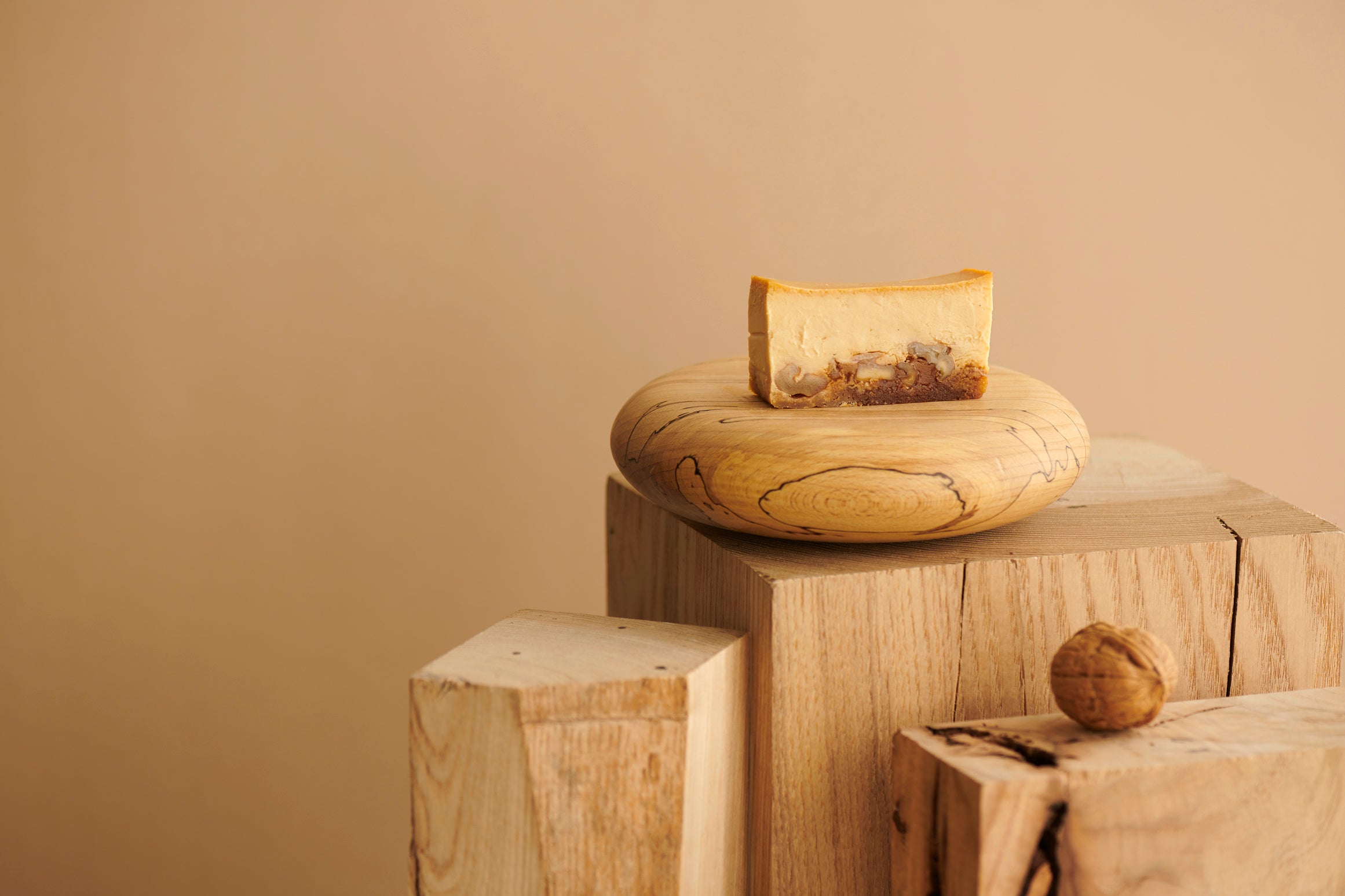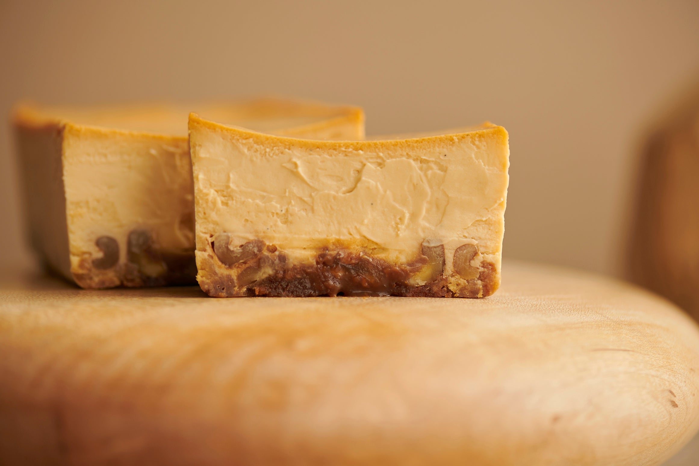 そして、クルミッ子らしさをより感じていただけるように、今回Mr. CHEESECAKEで初めて、ケーキの底にボトム生地を敷いています。ボトム生地は、食感が残るように浅めにローストしたクルミと、ガレットブルトンヌというバターを贅沢に使用したフランス伝統のクッキーを手作りし、そこへ生キャラメルを組み合わせ、クルミッ子を彷彿とさせるような味わいに仕上げました。クルミ、クッキー、生キャラメルで全体の味わいのバランスをまとめたボトム生地に、チーズケーキの生地を流して焼き上げることで、クッキーの食感が程良くしっとりとし、ボトム生地に一体感が生まれます。