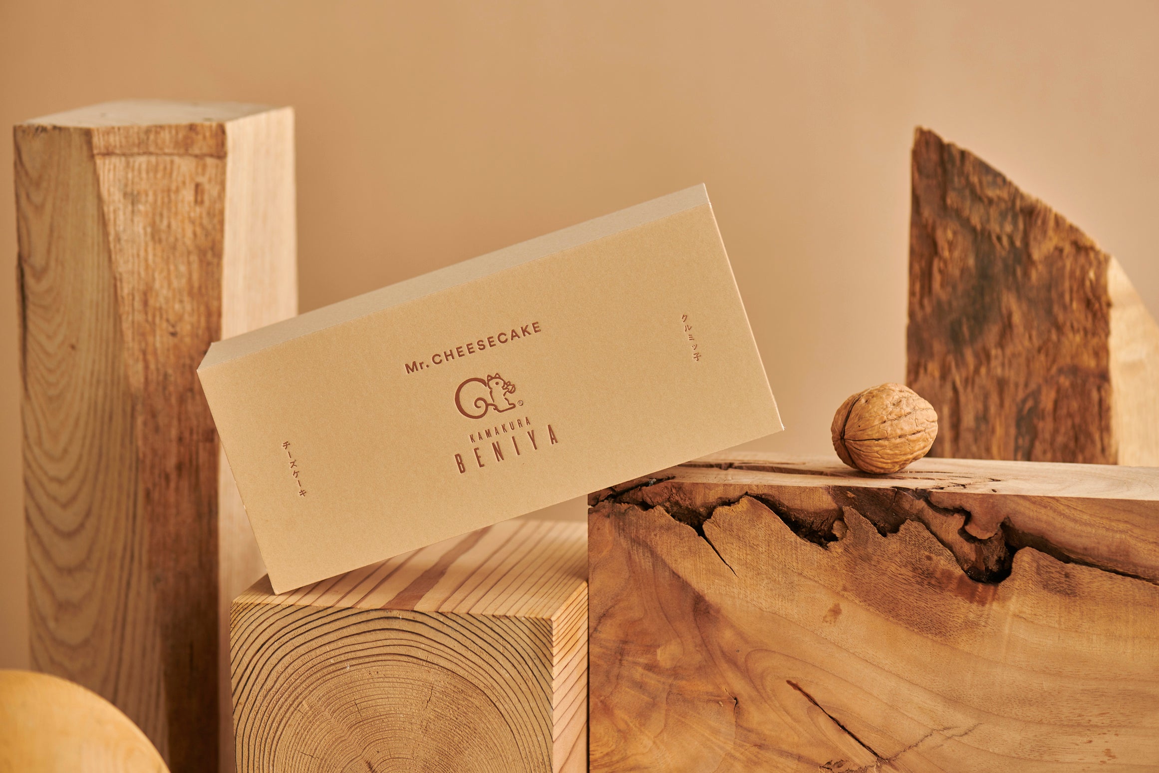 鎌倉紅谷の1番人気商品『クルミッ子』をMr. CHEESECAKEで包んだようなコラボレーションフレーバー。クルミッ子のキャラメルソースにMr. CHEESECAKEを象徴するバニラとトンカ豆を組み合わせて優しくやわらかい味わいに仕上げたケーキの底には、クルミッ子を表現した生地を敷き詰めました。レトロな見た目がかわいらしい鎌倉紅谷のシンボルキャラクター“リスくん”をあしらった、優しくやわらかい色合いの限定ボックスと、クルミッ子を彷彿とさせる色合いのサテンにチーズケーキを包んでお届けします。
