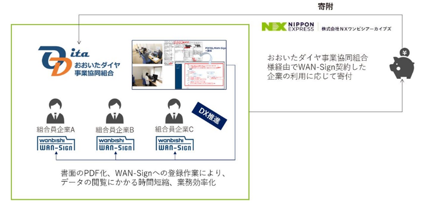 NIPPON EXPRESSホールディングス株式会社のグループ会社であり、電子契約・契約管理サービス「WAN-Sign」(URL: https://wan-sign.wanbishi.co.jp/)を提供する株式会社NXワンビシアーカイブズ(本社:東京都港区、代表取締役社長:高橋 豊)は、このたび、おおいたダイヤ事業協同組合(代表理事:羽生 正宗)と「おおいたダイヤ版地域還元モデル」に取り組むことに合意したことをお知らせいたします。