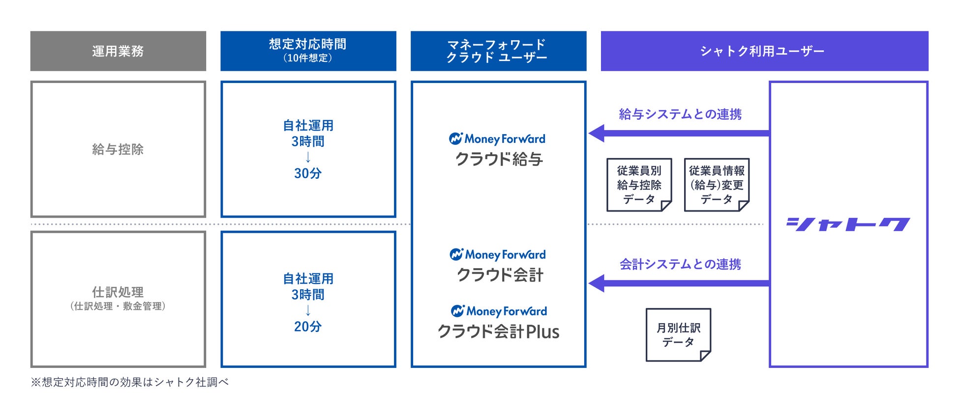 『シャトク福利厚生賃貸』と『マネーフォワード クラウド給与』と連携することで、従業員別の給与控除を自動的に行うことが可能になります。また、『マネーフォワード クラウド会計』『マネーフォワード クラウド会計Plus』との連携により、仕訳業務を効率化します。今後は、API連携などよるサービス情報連携も行い※1、『マネーフォワード クラウド』及び『シャトク福利厚生賃貸』の併用における圧倒的なUXを実現します。