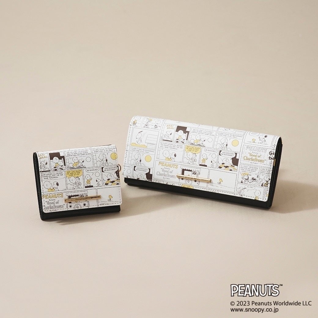 スヌーピーとチャーリー・ブラウンがハグをしているシーンのコミックアートをデザインした、オリジナル総柄のお財布。