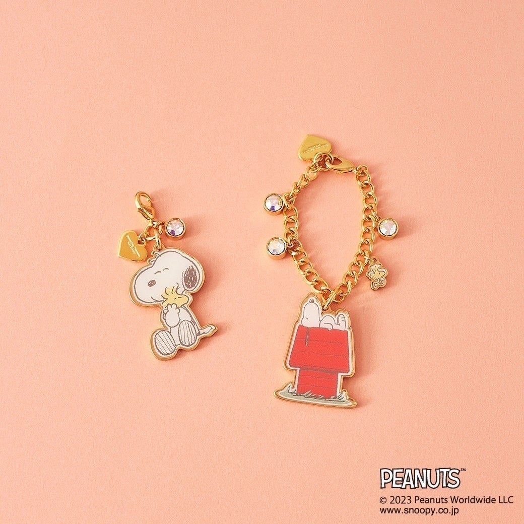 スヌーピーが屋根の上で寝ているデザインのバッグチャームや、スヌーピーとウッドストックが“ハグ”しているシーンを切り取ったファスナーチャーム。配色やデザインに温かみが感じられるデザイン。