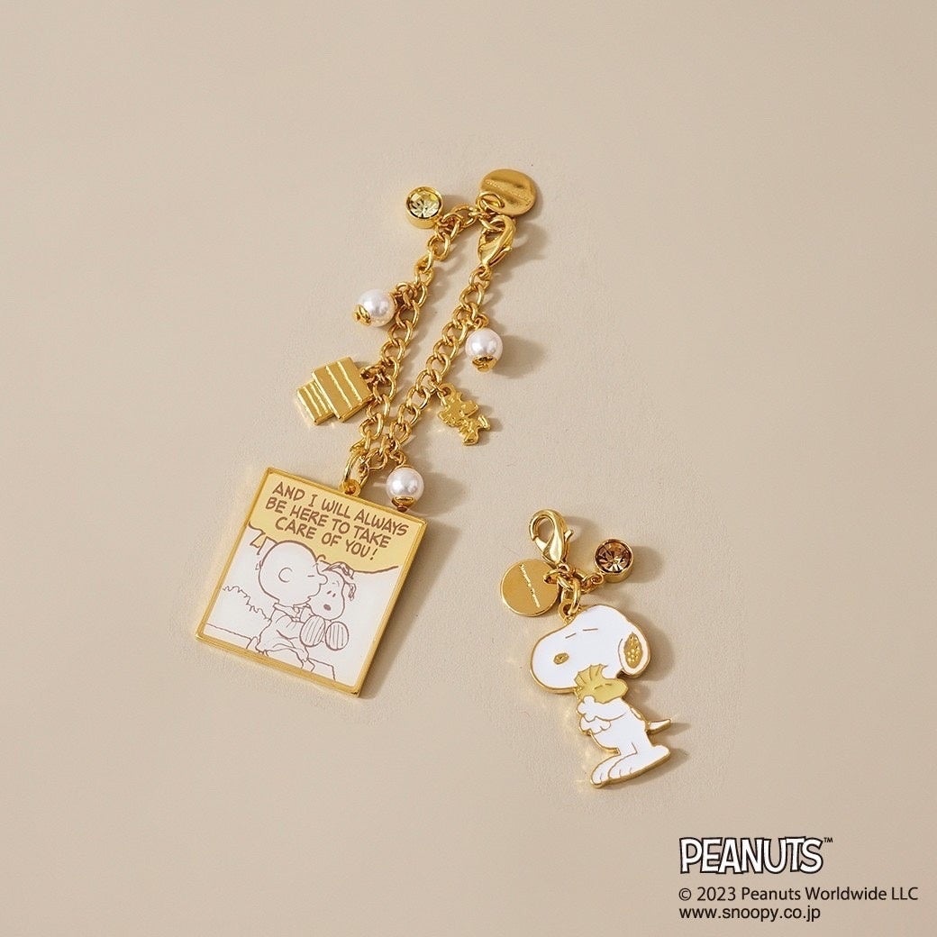 チャーリー・ブラウンがスヌーピーを抱き上げ、「I will always be here to take care of you!!」(僕がずっとそばにいるからね!!)と伝える1シーンを切りとったバッグチャームと、ウッドストックをぎゅっと抱きしめるスヌーピーのファスナーチャーム。