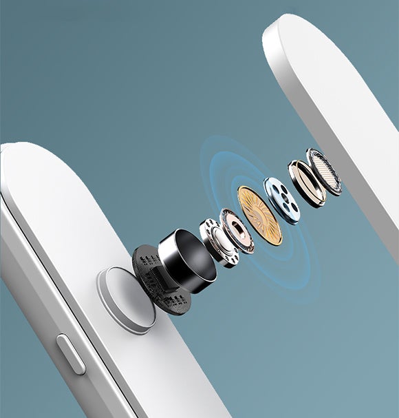 一般的なスピーカーは、気導音で音を伝えています。「Bonio」は骨導音で音を聴く仕組みを利用しております。つまり、耳ではなく骨の振動で音を聴く仕組みで、耳をふさがず長時間も音楽を聞いても疲れにくいです。