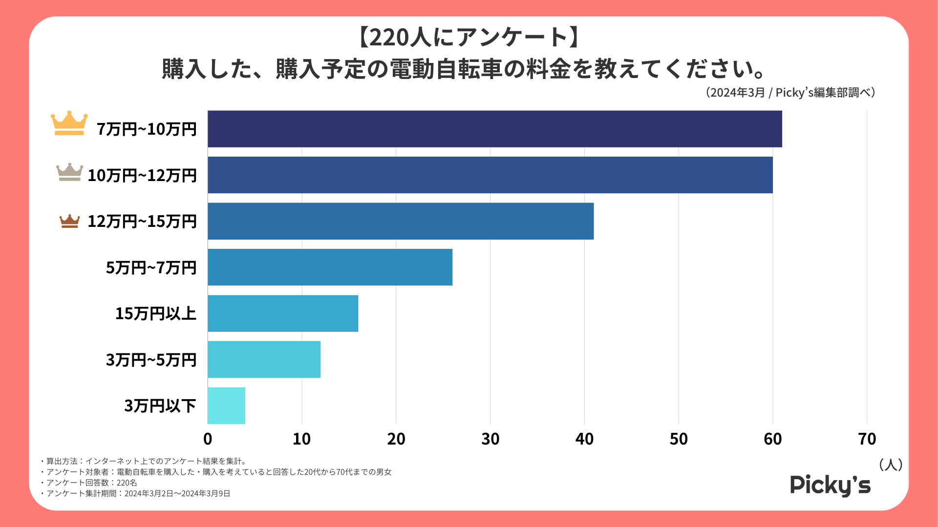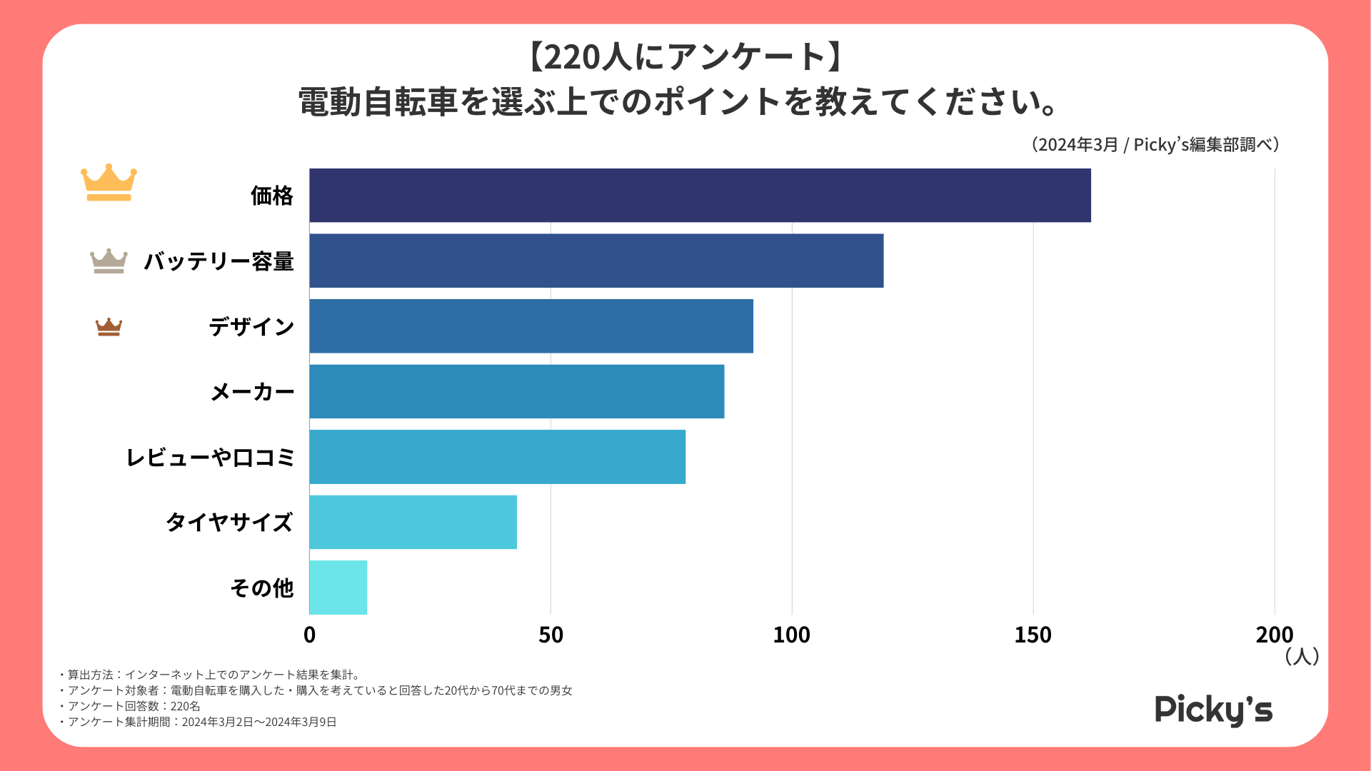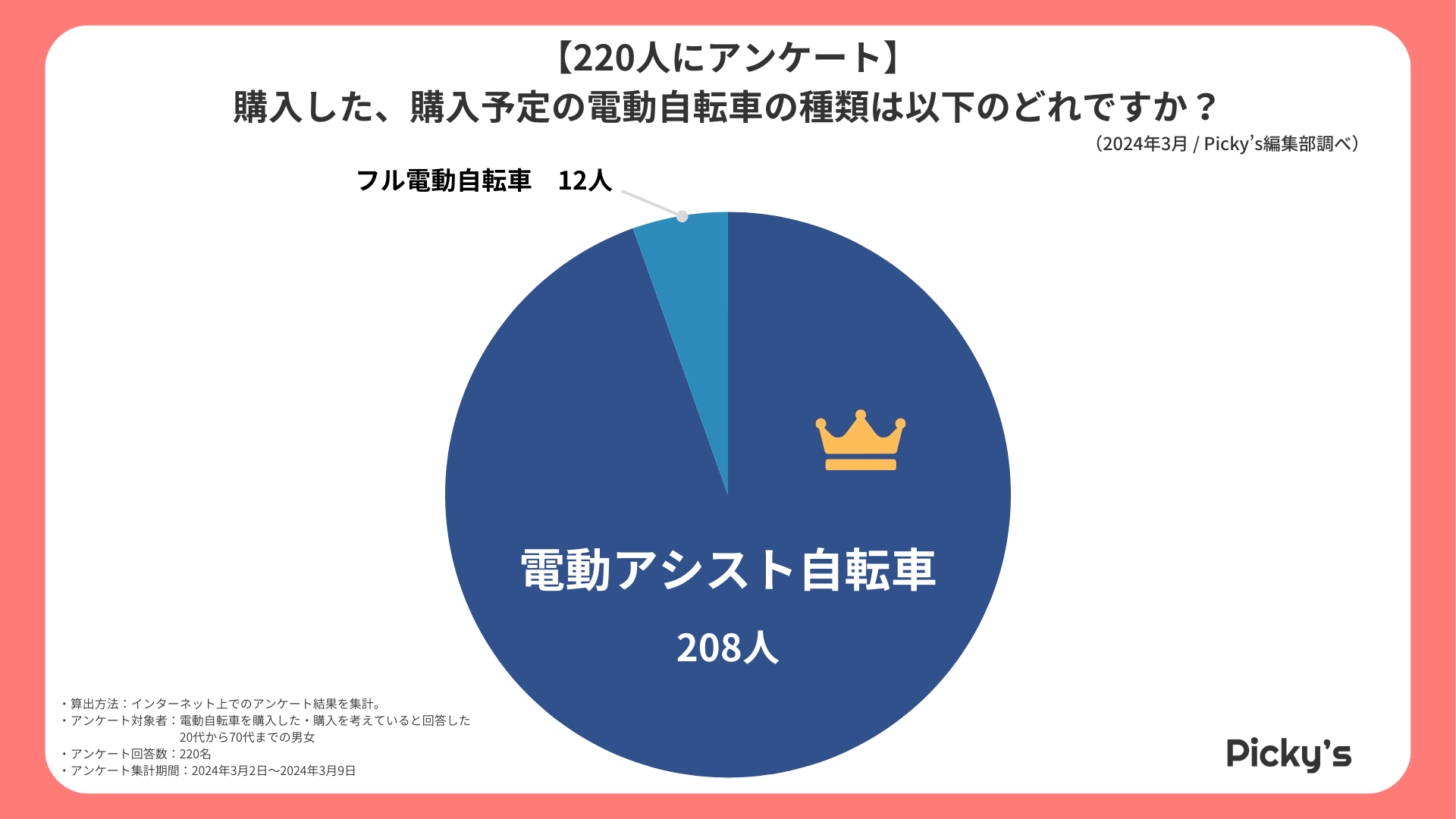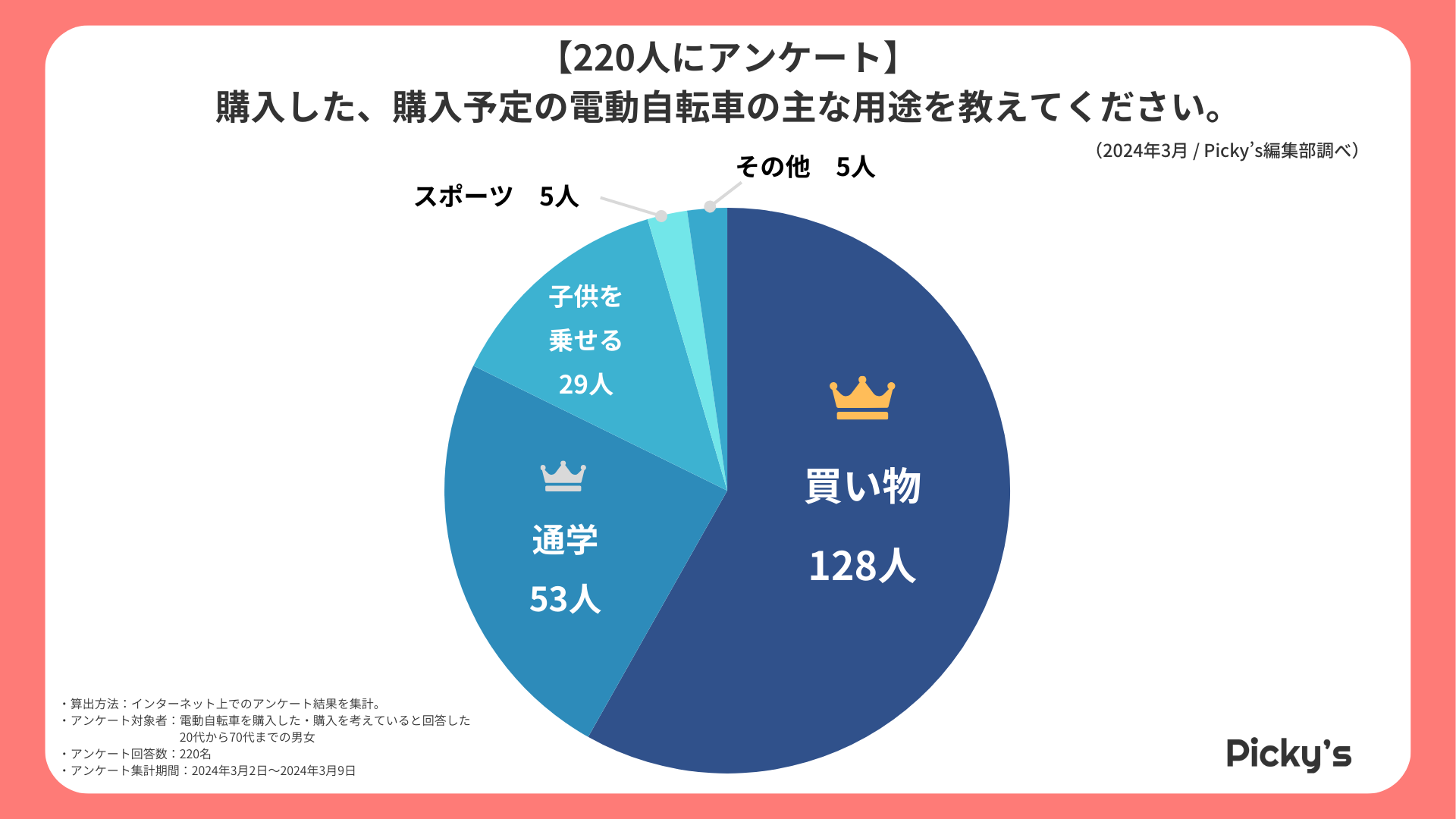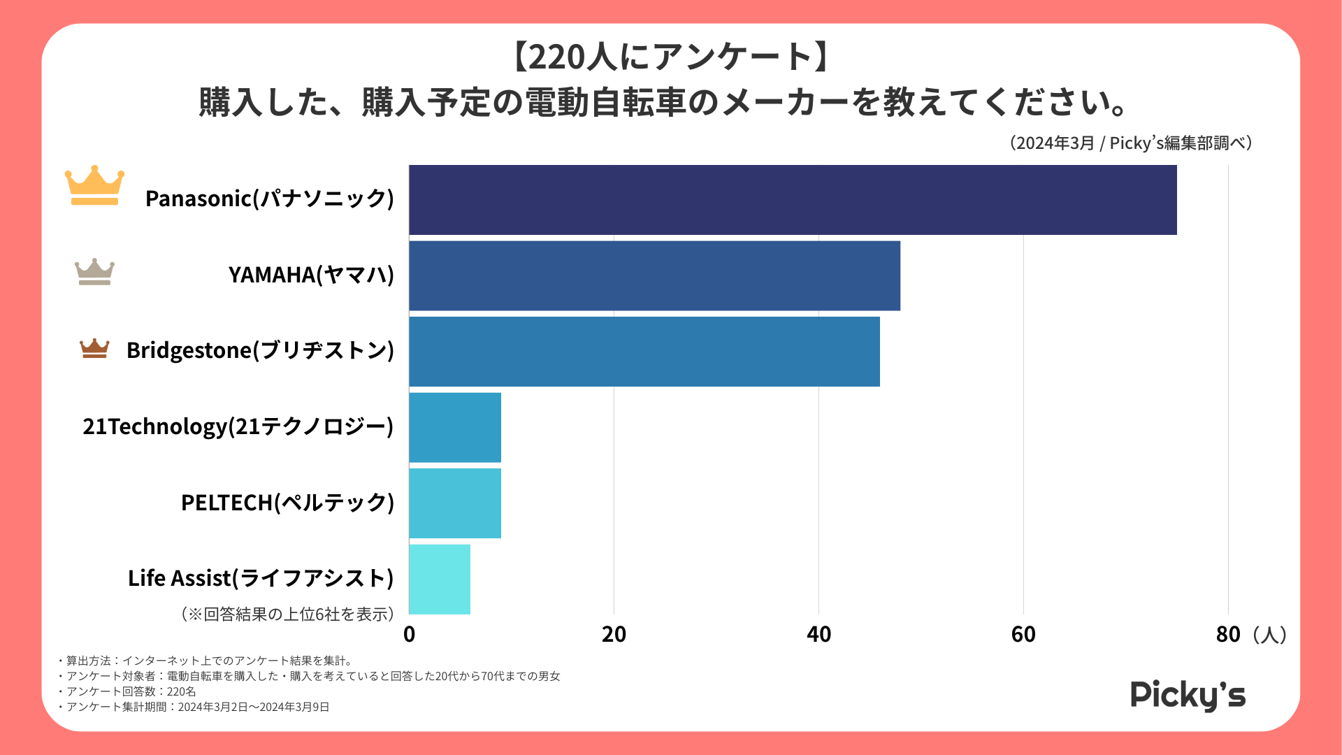 「Picky’s」は、インターネットショッピングにおいて、購入前に試せない・選ぶべきものがわからないという課題の解決を目標に、あらゆる商品のおすすめランキングや検証レビューを紹介するサイトです。このたびPicky’s(https://rentry.jp/)では、電動自転車についてインターネット上でアンケート調査を行いましたので発表いたします。