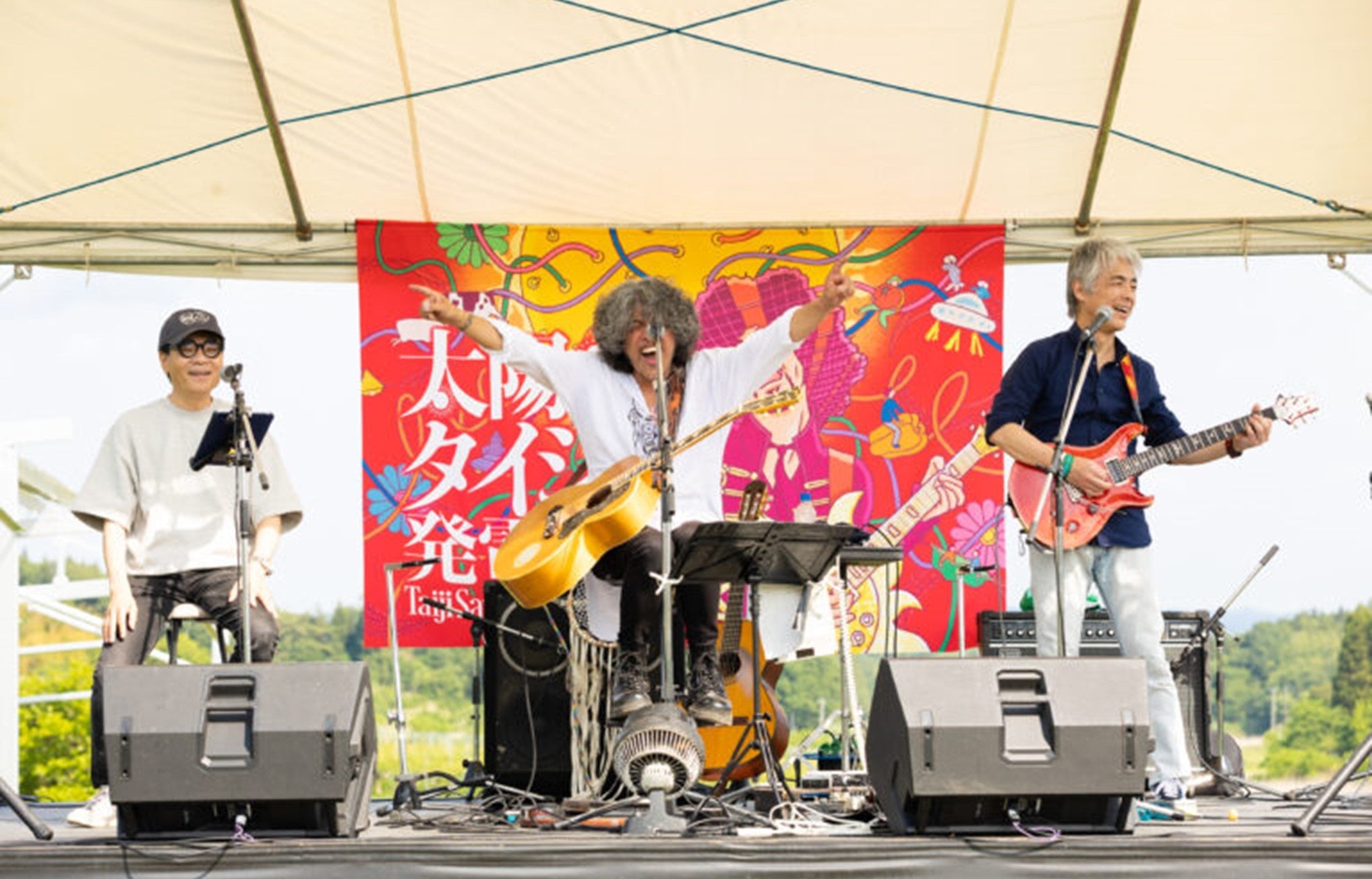 また、2023年5月27日には、福島県矢吹町にある「太陽のタイジ発電所」にて、佐藤タイジさん、いとうせいこうさん、うじきつよしさんら3名のアーティストが集い、ご契約者様限定のライブイベント「ソラフェス!」を開催しました。電気を作っているアーティストと電気を使っているファンが集うという新しいライブイベントです。発電所に囲まれた野外にステージを組みたて、演奏に使用する電源は太陽のエネルギーを溜めた蓄電池を使用しました。