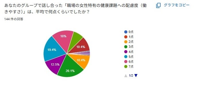 勉強会参加後に「職場における女性特有の健康課題への配慮度」についてのアンケートを実施しました。その結果、144名が回答。評価は平均4.82点/10点にとどまり、5点以下と回答した社員が64%を占めるなど、改善の余地があることが浮き彫りとなりました。一方で、7点以上と評価した回答は全体の20%にとどまり、部署や職務による認識の差が示唆されました。